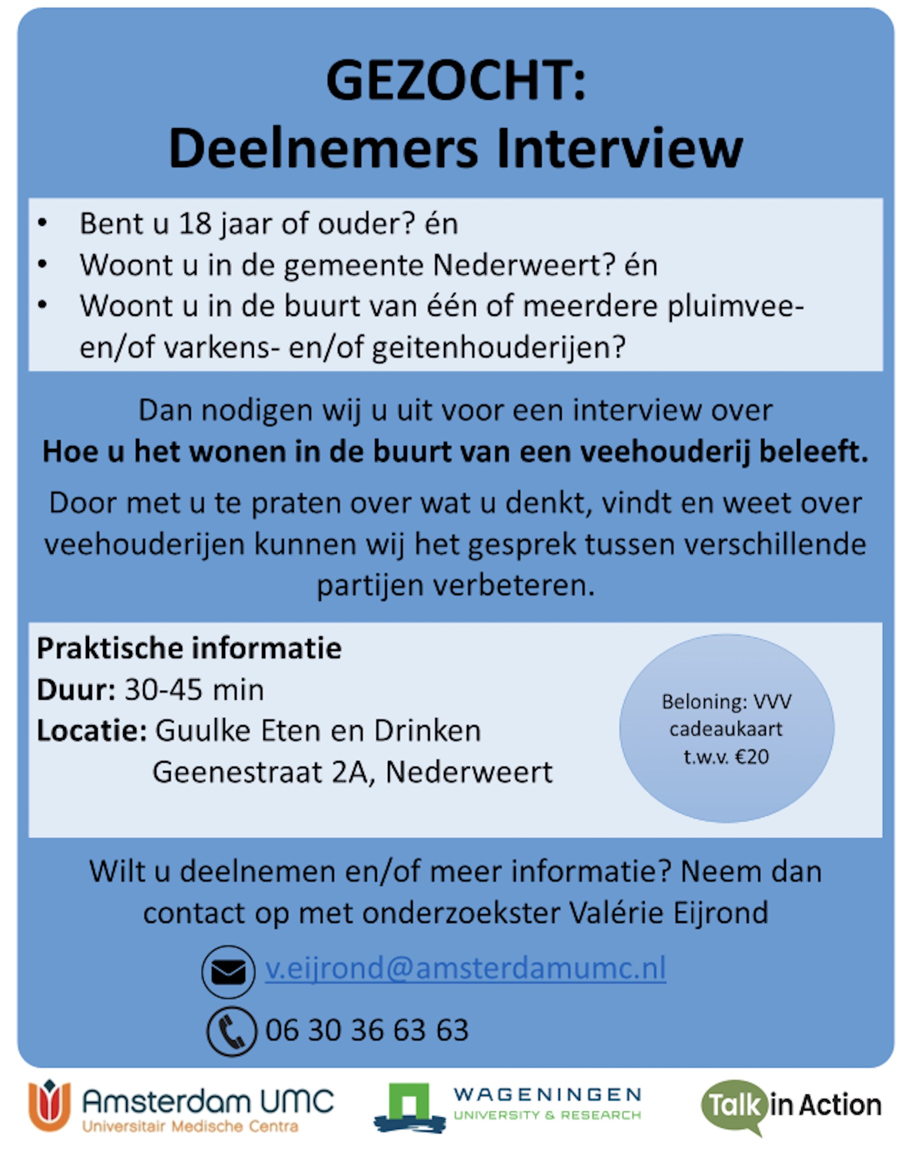 Het interview gaat over wat jij denkt, vindt en weet over veehouderijen. Het interview zal plaatsvinden bij het restaurant Guulke Eten en Drinken (Geenestraat 2A) en duurt 30 tot 45 minuten. Je ontvangt aan het einde van de interview een VVV cadeaukaart t.w.v. €20.