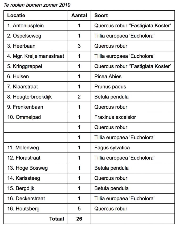 In onderstaande tabel staan de locaties en de te verwijderen bomen weergegeven.