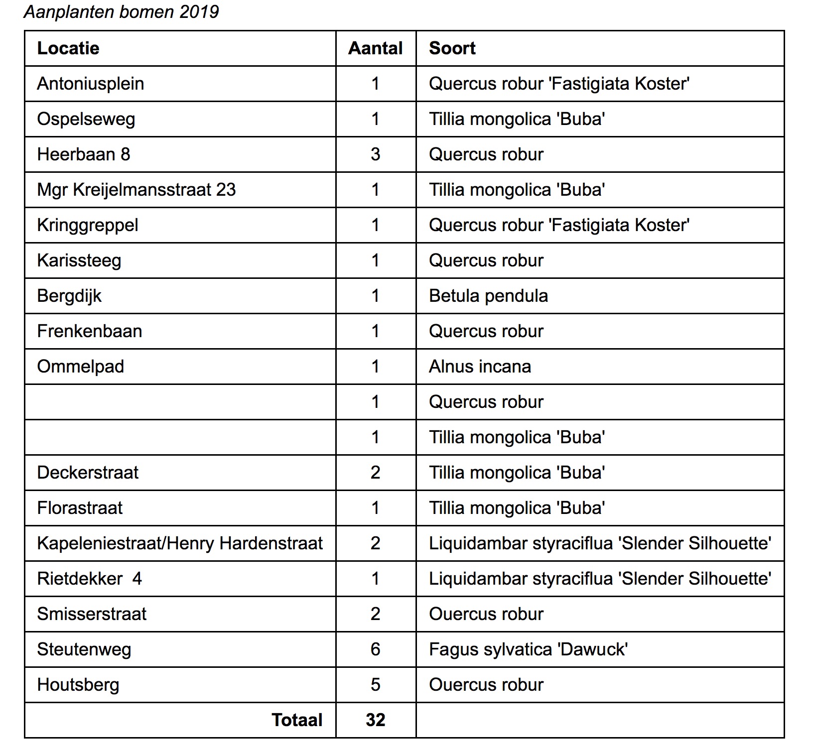 In de onderstaande tabel staan de locaties en de aan te planten bomen weergegeven.