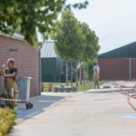 Met twee blusvoertuigen wordt op dit moment gepoogd om de temperatuur in de stallen omlaag te krijgen.