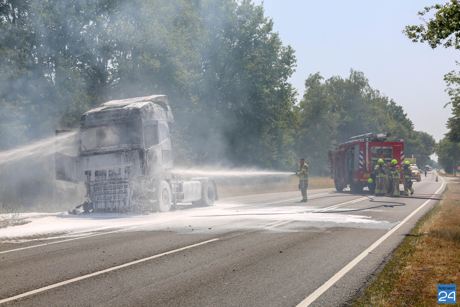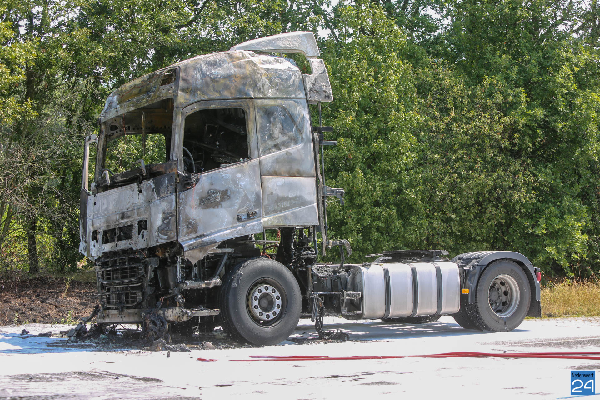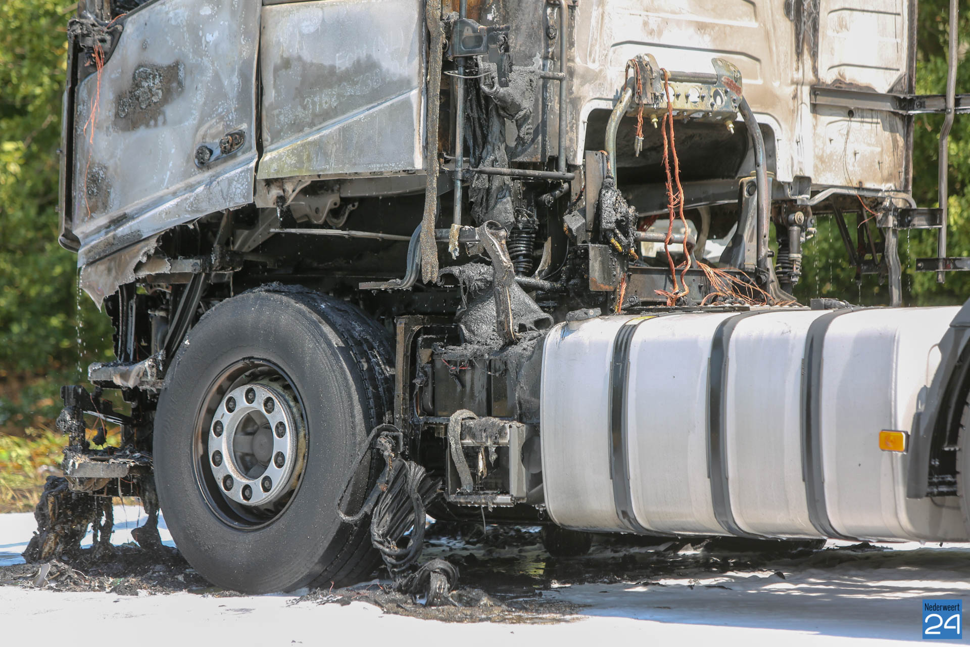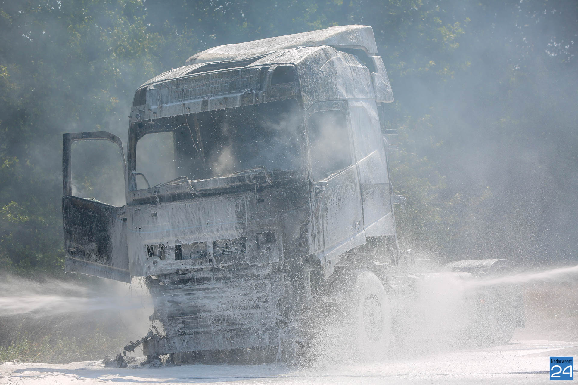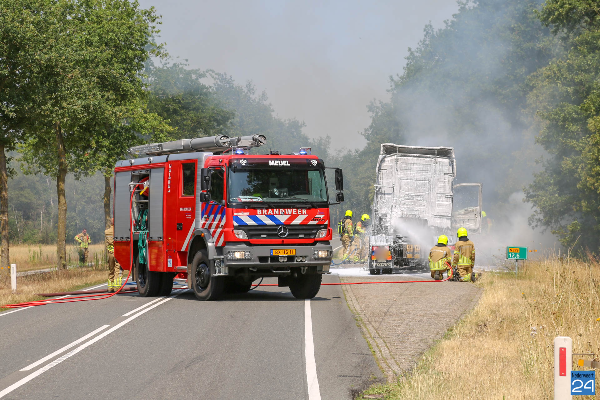 Een vrachtwagen is donderdagmiddag volledig uitgebrand op de Meijelseweg in Heibloem. De chauffeur reed vanuit de richting van Heibloem richting Meijel.