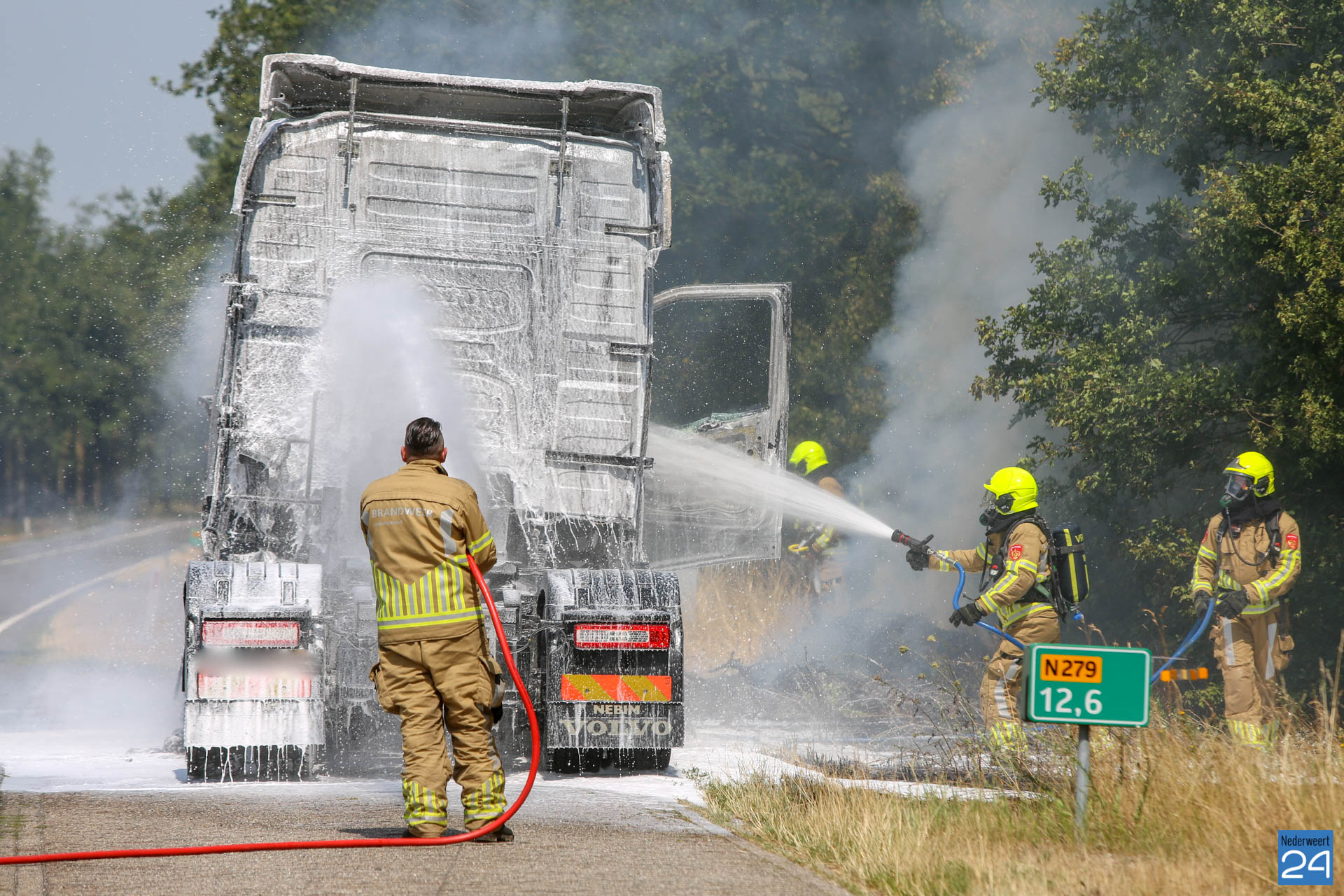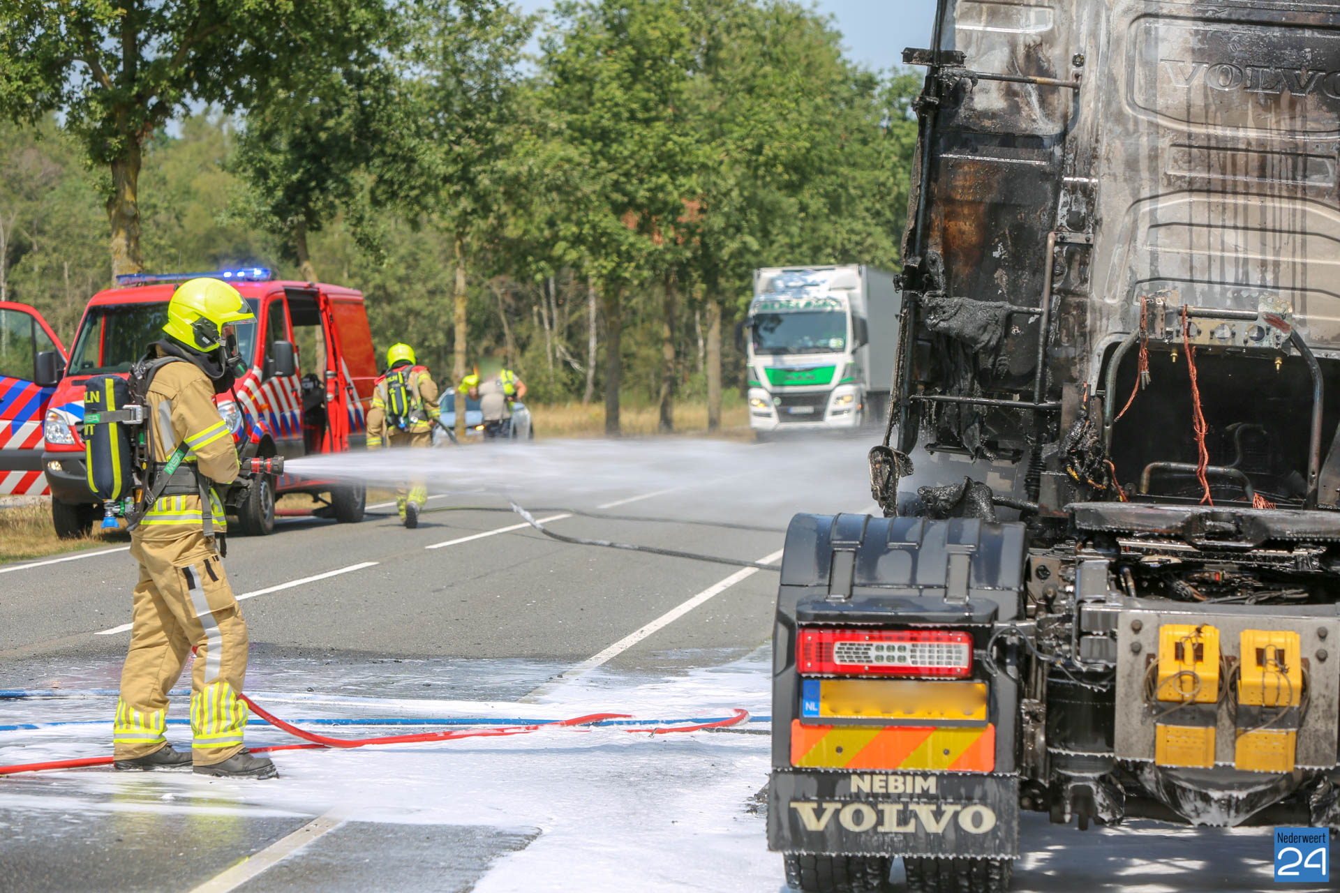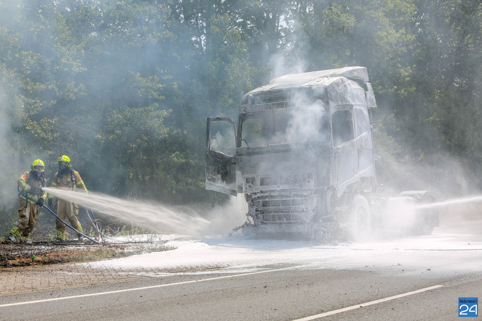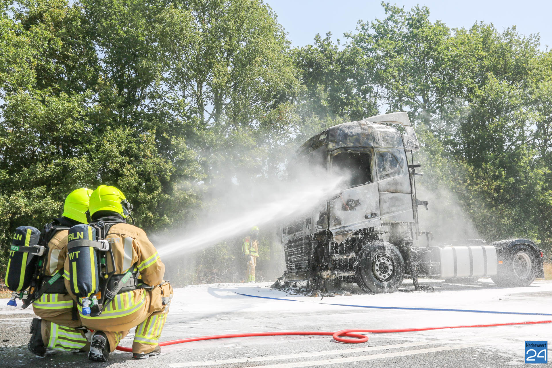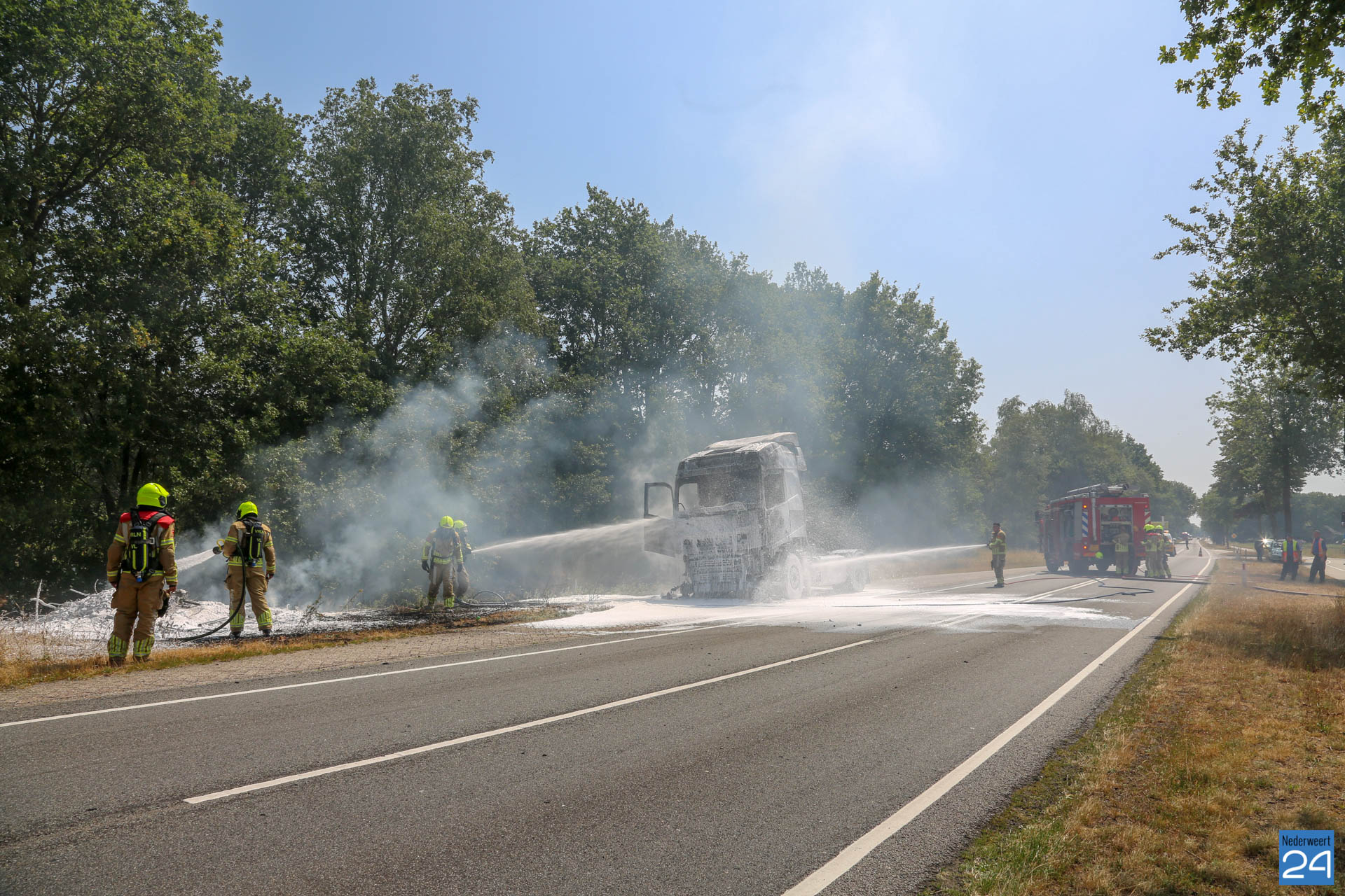 Een vrachtwagen is donderdagmiddag volledig uitgebrand op de Meijelseweg in Heibloem. De chauffeur reed vanuit de richting van Heibloem richting Meijel.
