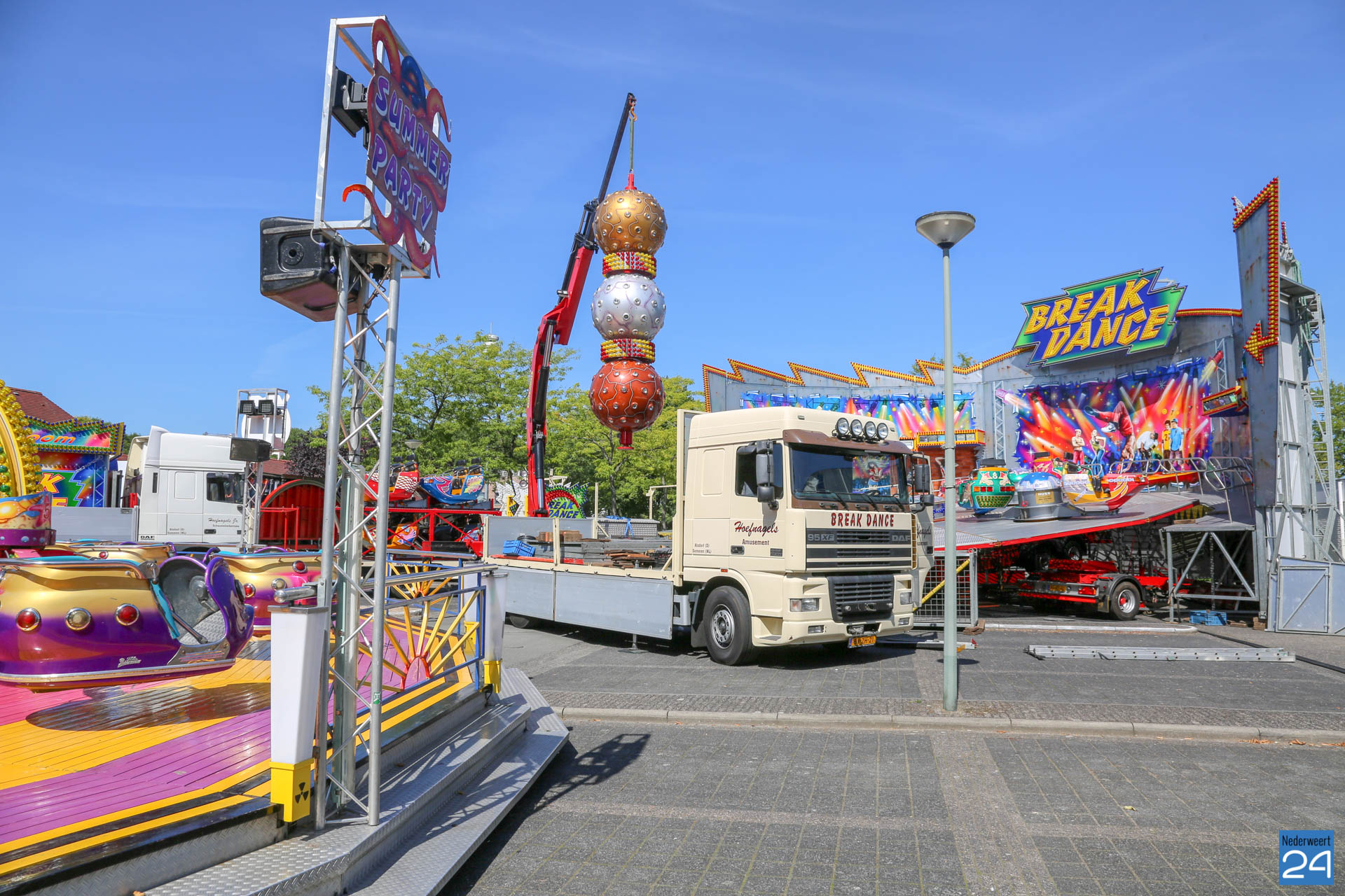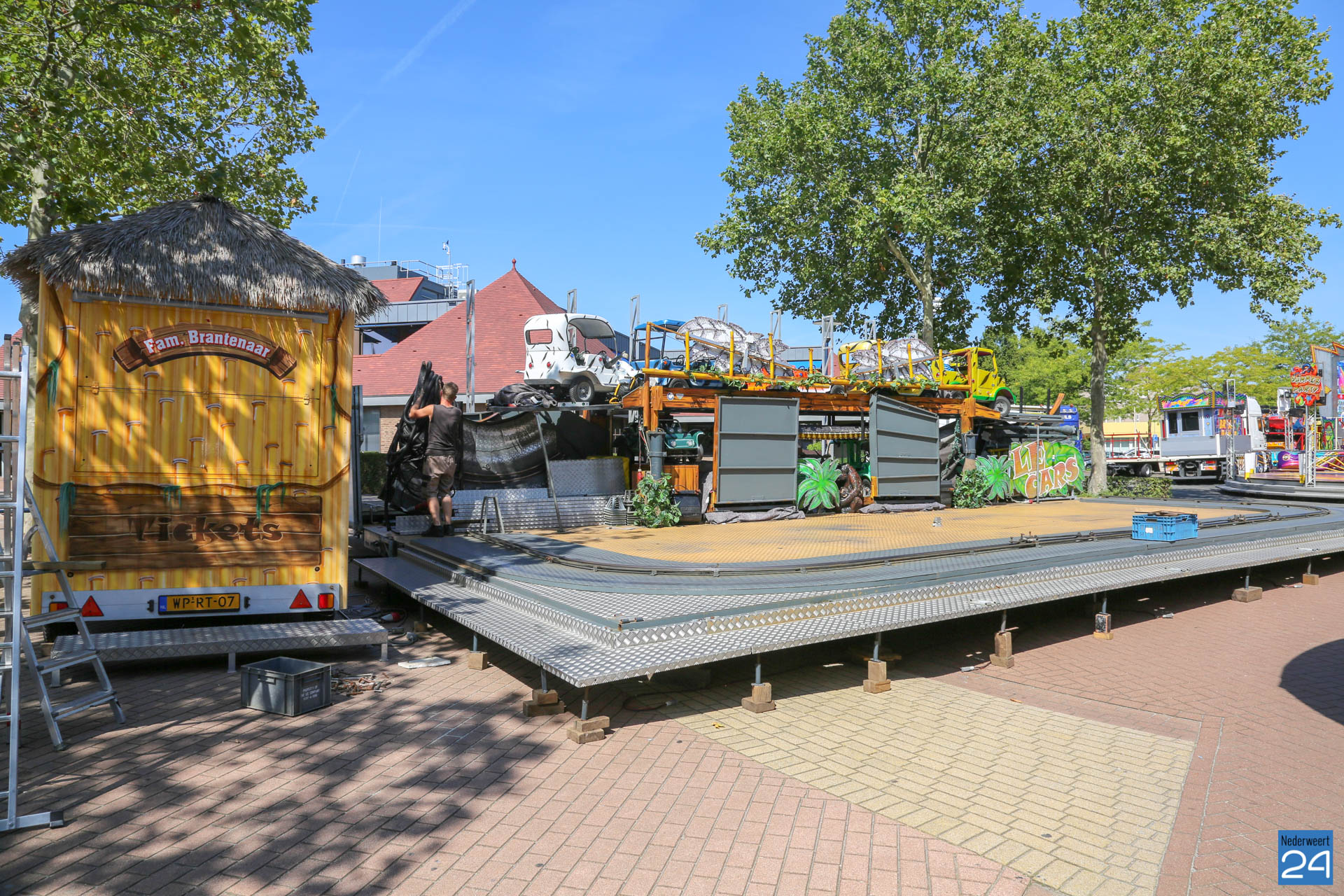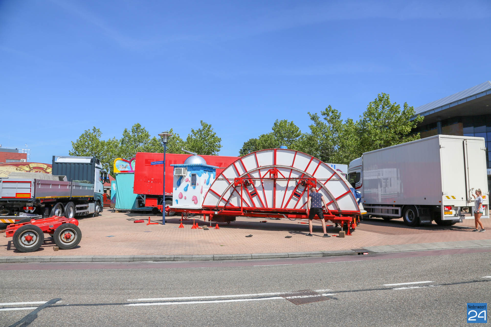 De opbouw van de kermis in Nederweert is van start. Woensdagmiddag arriveerden de eerste kermisexploitanten met hun attracties op het Raadhuisplein en Geenestraat. Donderdag was het een drukte van jewelste op het kermisterrein.