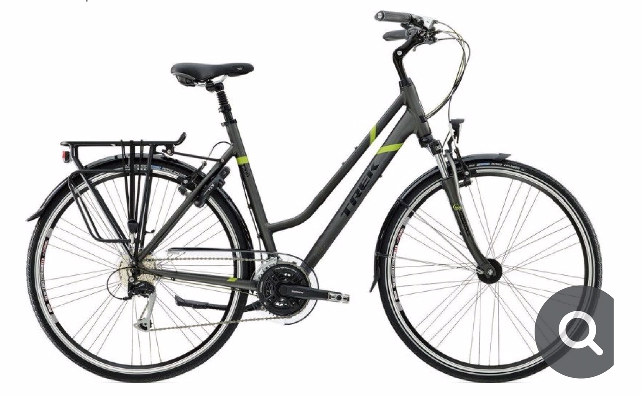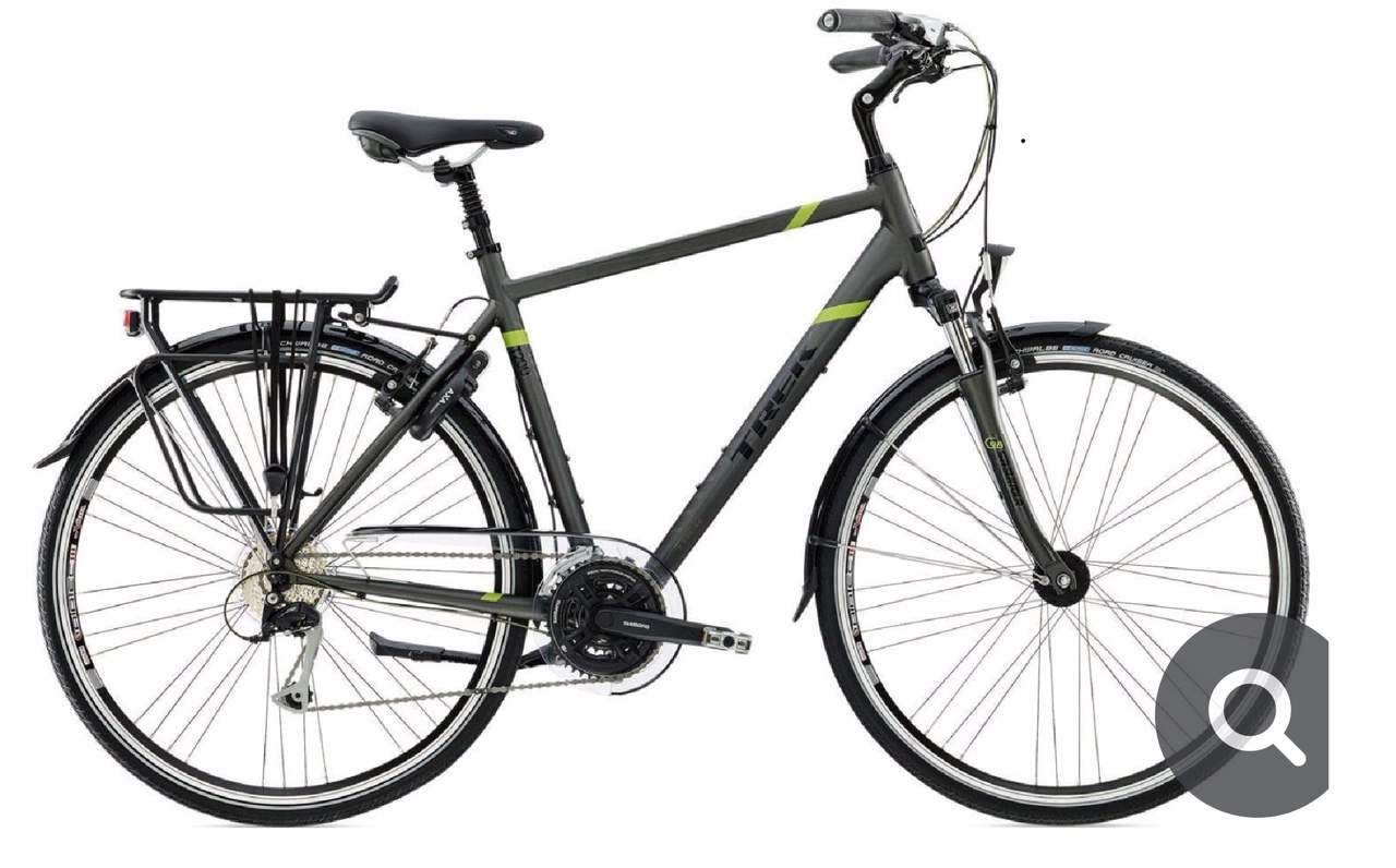 De twee fietsen zijn grijs van kleur en hebben groene stickers. Het merk is Trek en het gaat om het type T200.
