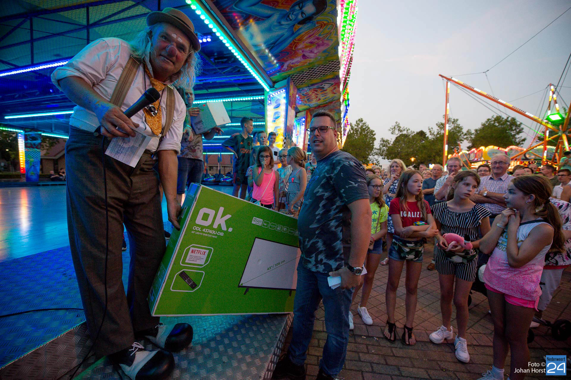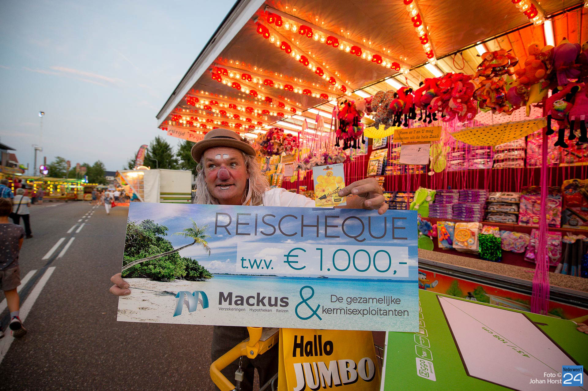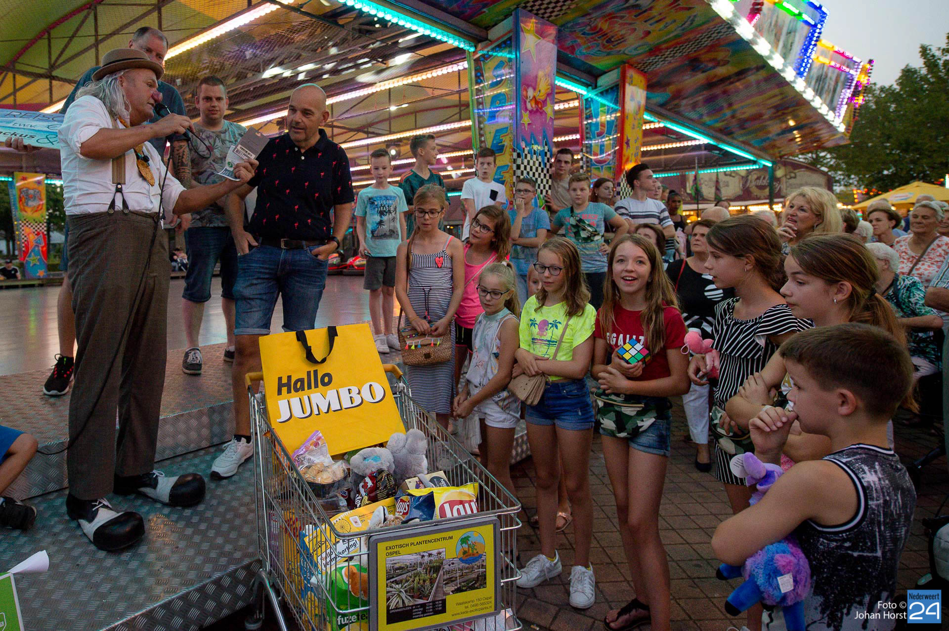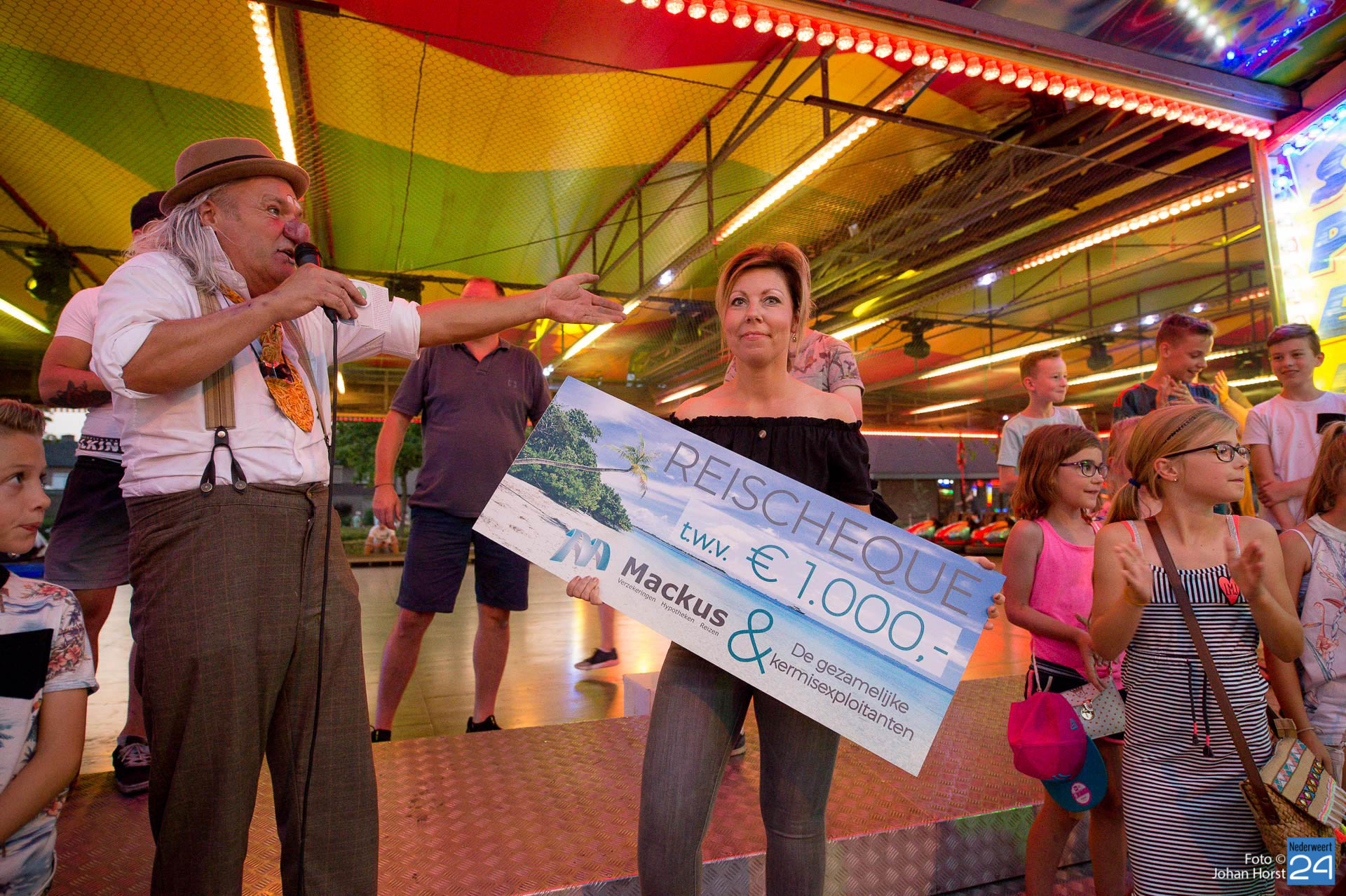 Maandagavond om half negen was het tijd voor de grote kermisloterij. De kermisexploitanten hebben gezorgd voor grote prijzen. Bij de botsauto’s verzamelde tientallen wachtende deelnemers voor de loterij. Clown Des Alles verzorgde de trekking. De hoofdprijs was een reischeque ter waarde van €1000,- samengesteld door Mackus Financiële Dienstverlening en Reisbureau in Nederweert en de gezamenlijke kermisexploitanten. Ook een flatscreen TV en een winkelwagen vol boodschappen werden weggegeven aan de gelukkige winnaars.