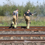 De brandweer ging uiterst voorzichtig te werk omdat ze over het spoor heen moesten. Aan beide zijden werd een brandweerman op de uitkijk gezet om te kijken of er geen trein aan kwam. Met vuurzwepen en water werden de brandjes allemaal geblust. Inmiddels is het treinverkeer ook volledig hervat.