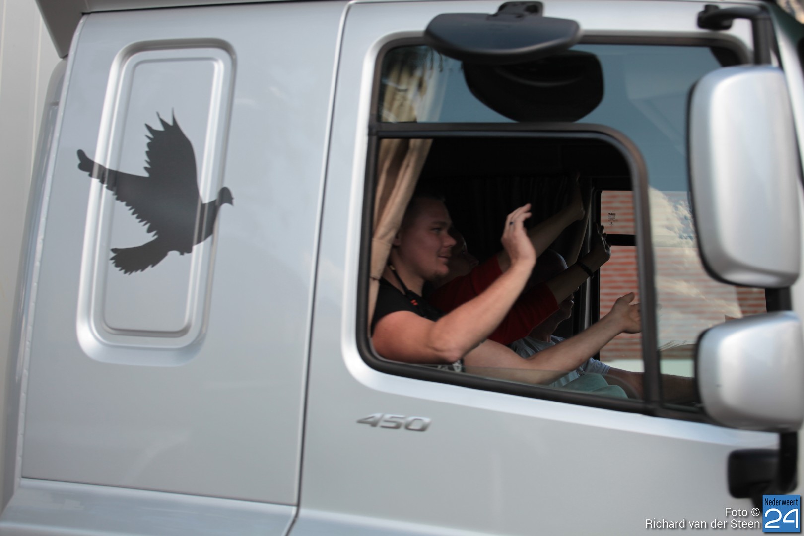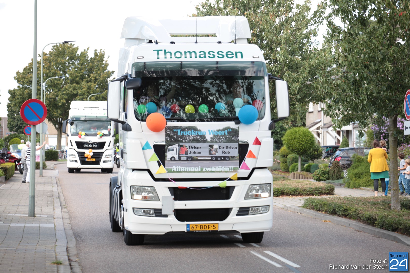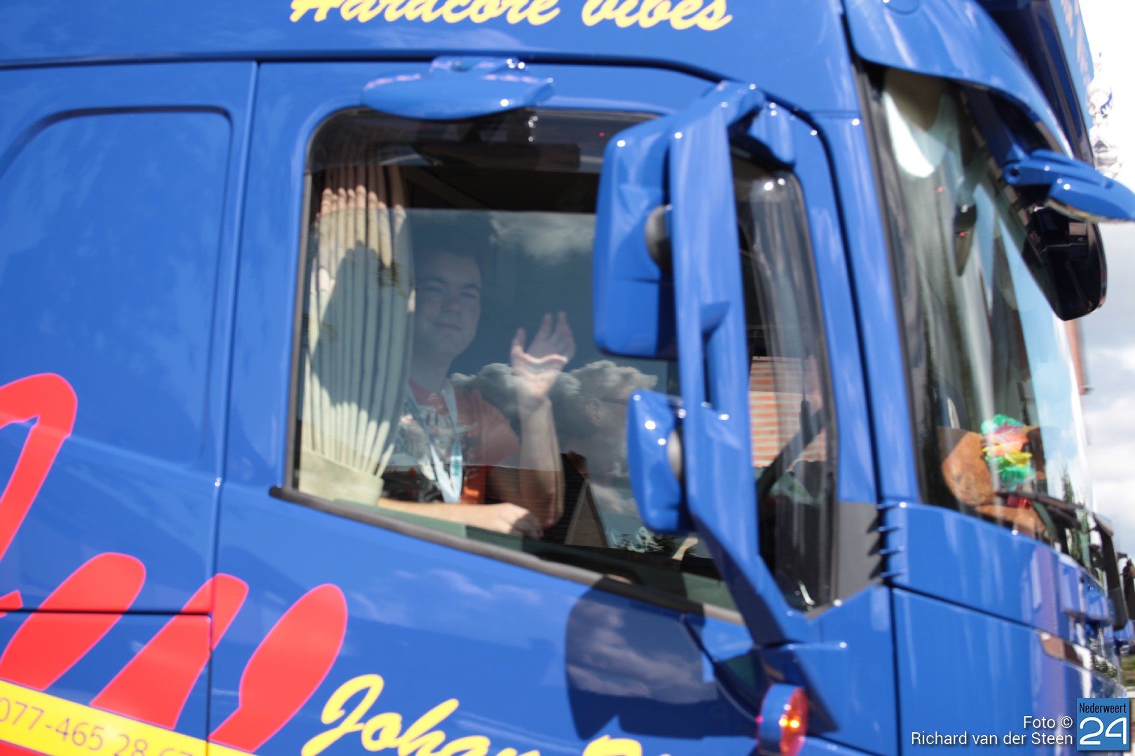 Onder luid getoeter van de vrachtwagens trok de stoet al toeterend voorbij. Wat een plezier voor de bijrijder, de chauffeurs en de toeschouwers naast de weg.