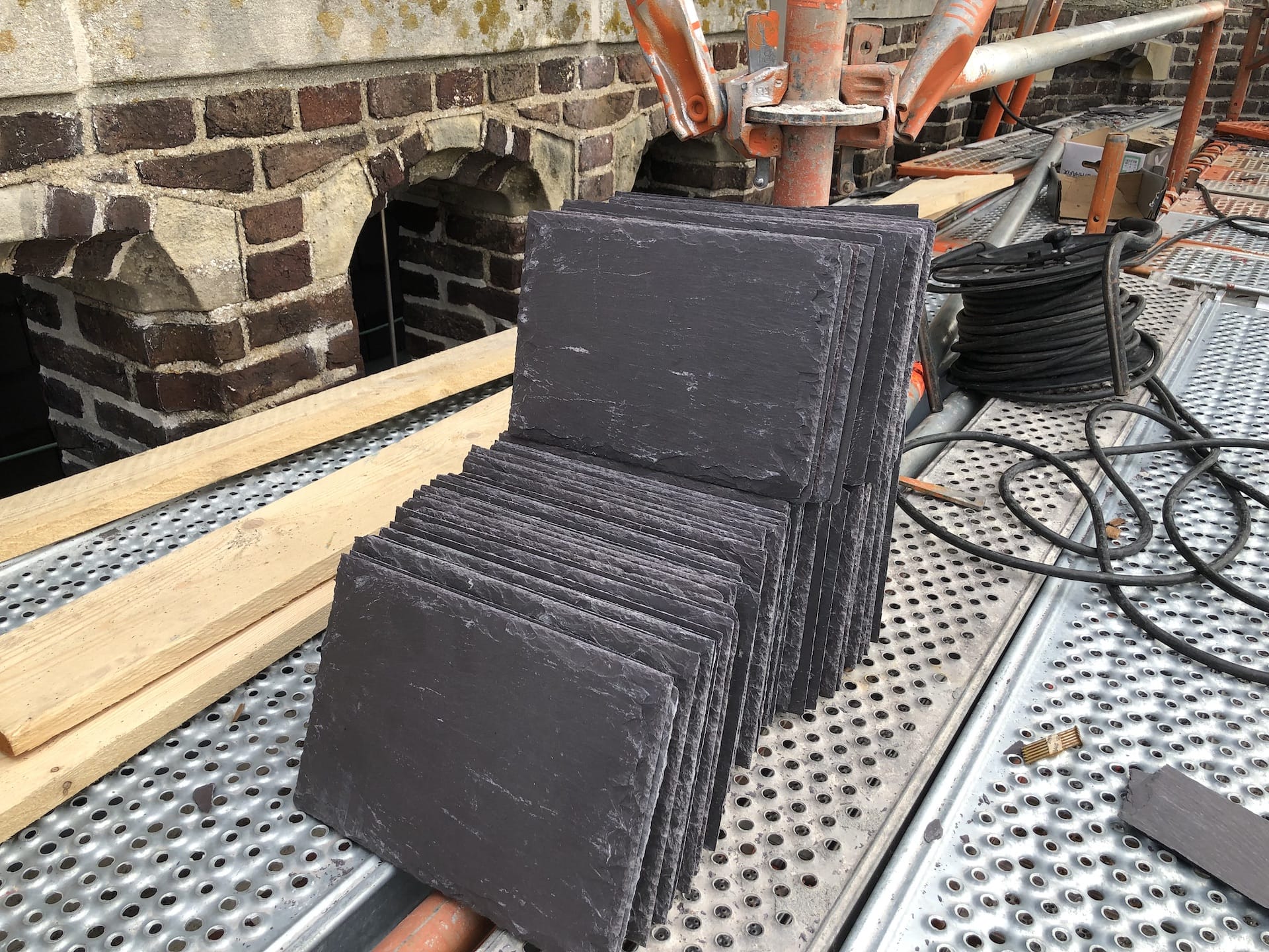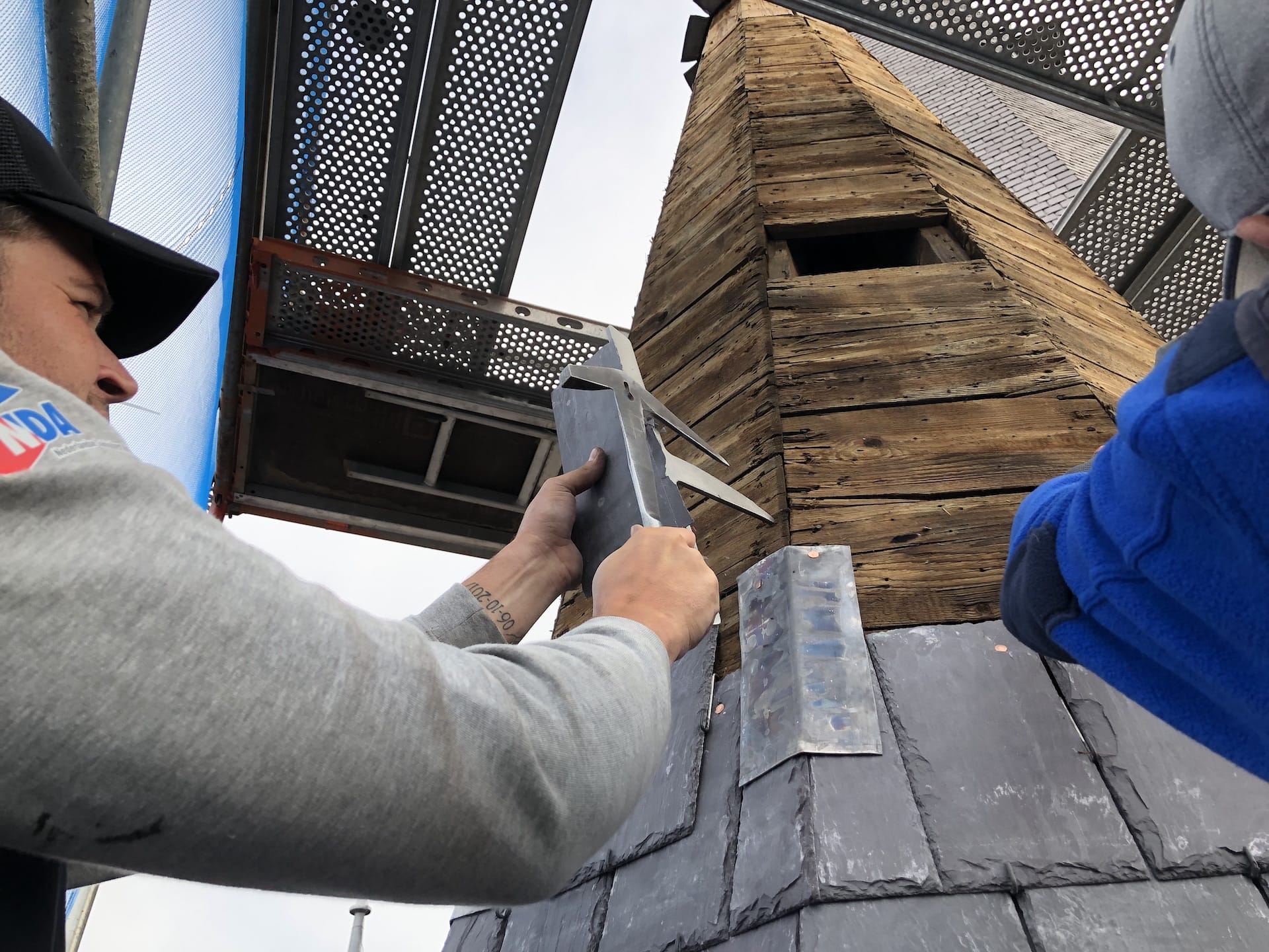Met een onvoorstelbare combinatie van millimeterprecisie aan de ene kant, en ambachtelijke snelheid aan de andere kant, wordt lei na lei op maat gekapt, van gaatjes voorzien en met spijkertjes vastgeslagen. Met roodkoperen spijkers, want die kunnen niet meer wegroesten, zoals met de vorige uitvoering wel het geval was. Het is echt maatwerk, want door hun veelhoekige vorm is een lekkage in de spitsjes zo ontstaan.