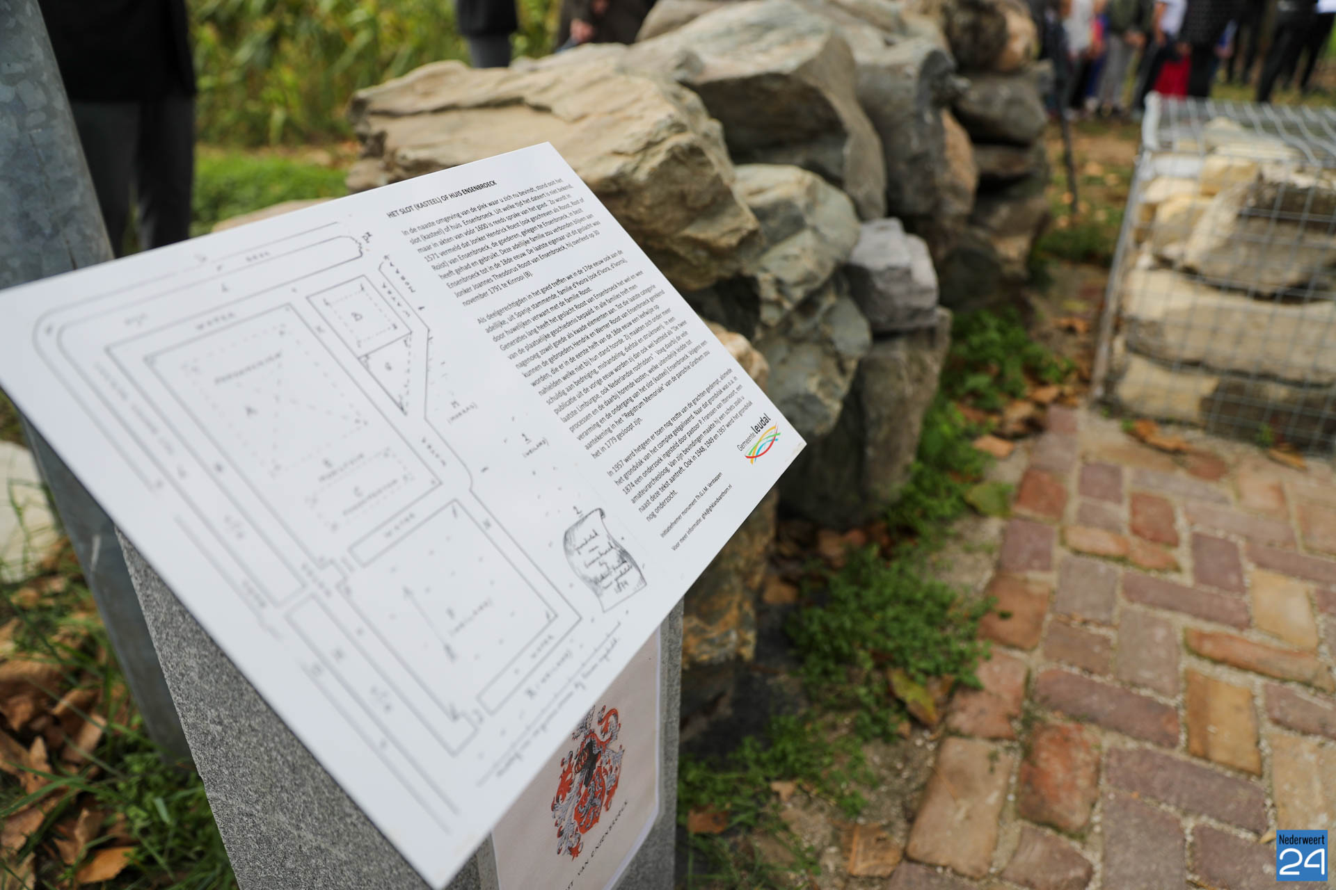“Het kasteel is eind 19e eeuw gesloopt en geslecht. De grachten gedempt in 1957. Wat bleef zijn: akkerland, verhalen over roofridders, over onderaardse gangen, over een Spaanse edelman, over geheimzinnig moeras, e.d. Restanten zijn uiteindelijk in de wijde omgeving teruggevonden, vaak na een lange omweg” aldus Thei Verstappen. “Het gedenkteken hebben we geheel uit die teruggevonden restanten opgebouwd“.