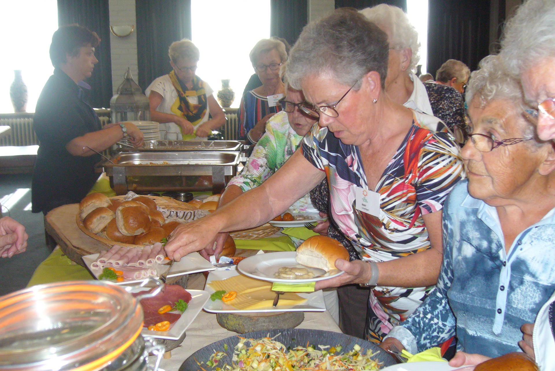 Vervolgens werd het smakelijk smullen van een heel goed verzorgde uitgebreide warme lunch in buffetvorm. Iedereen genoot van de maaltijd en van elkaars gezelschap.