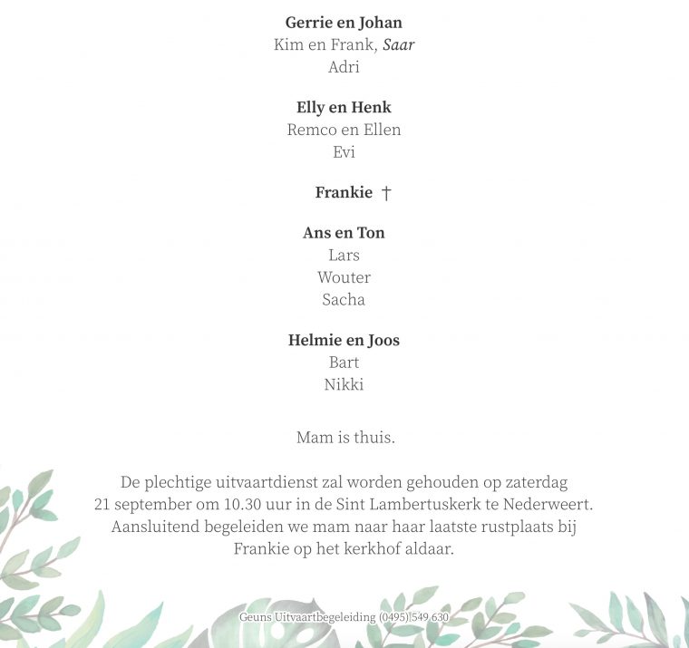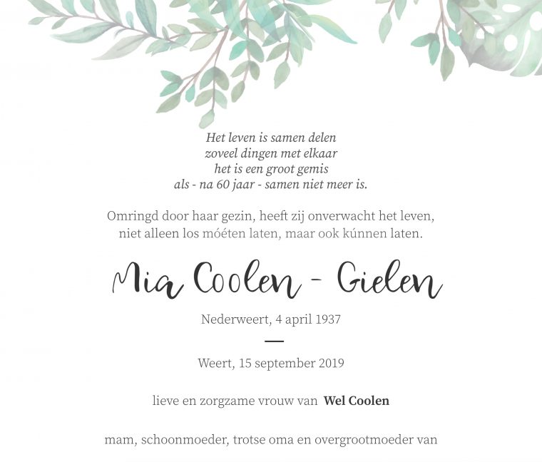 Gecondoleerd met het verlies van uw vrouw, jullie (schoon)moeder, oma en overgrootmoeder. Heel veel sterkte toegewenst.