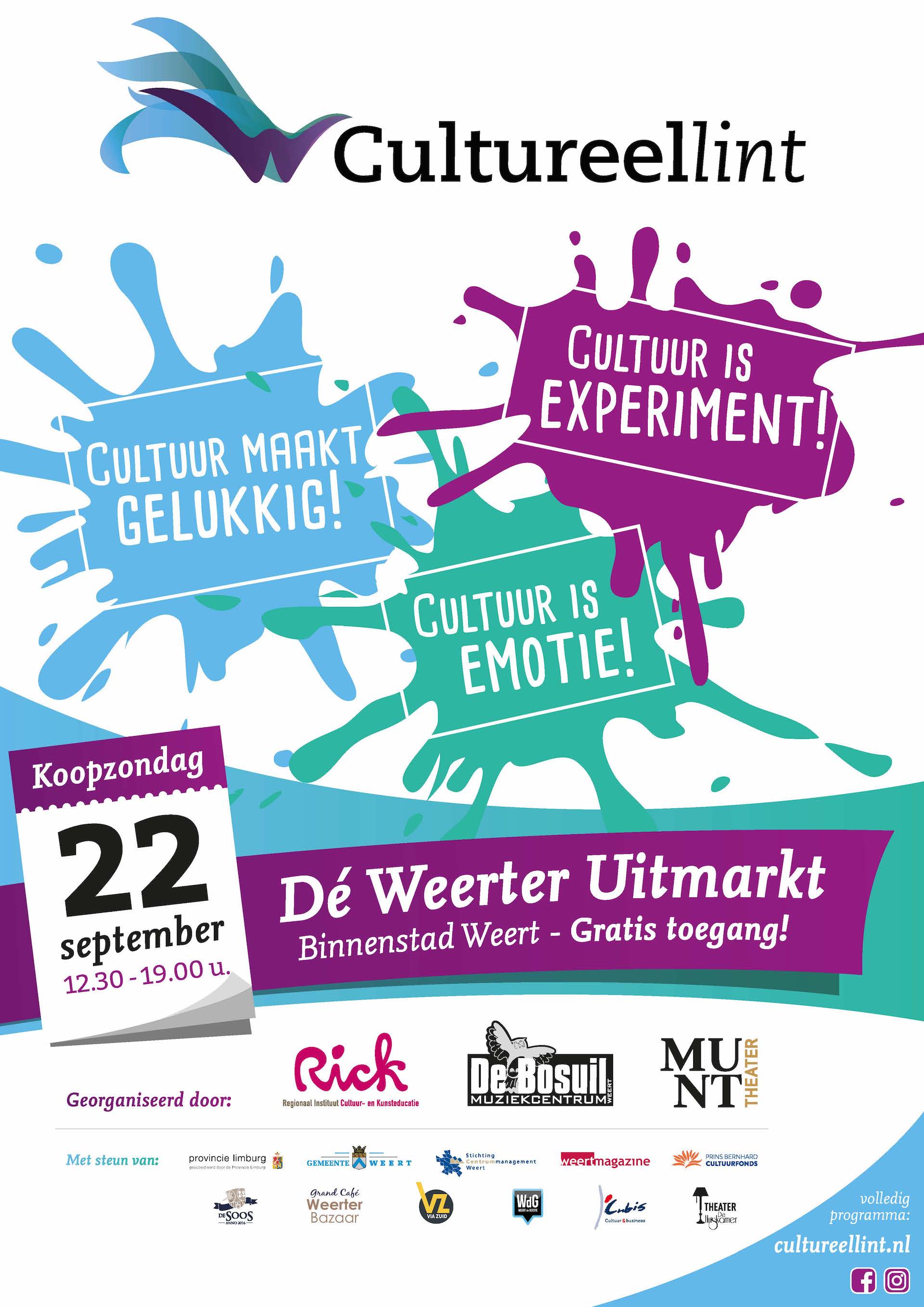 Het programma van het Cultureel Lint, dé Weerter uitmarkt, is bekend. Op koopzondag 22 september genieten bezoekers op meer dan 40 locaties verspreid over de Weerter binnenstad van de opening van het culturele seizoen. De diverse pleinen, buiten- en binnen locaties in de Weerter binnenstad worden omgetoverd tot een dynamische culturele beleving. Het centrum van Weert is van 12.30u tot 19.00u dé plek voor families, vrienden, jong en oud om zich te laten amuseren, verrassen en laten informeren.