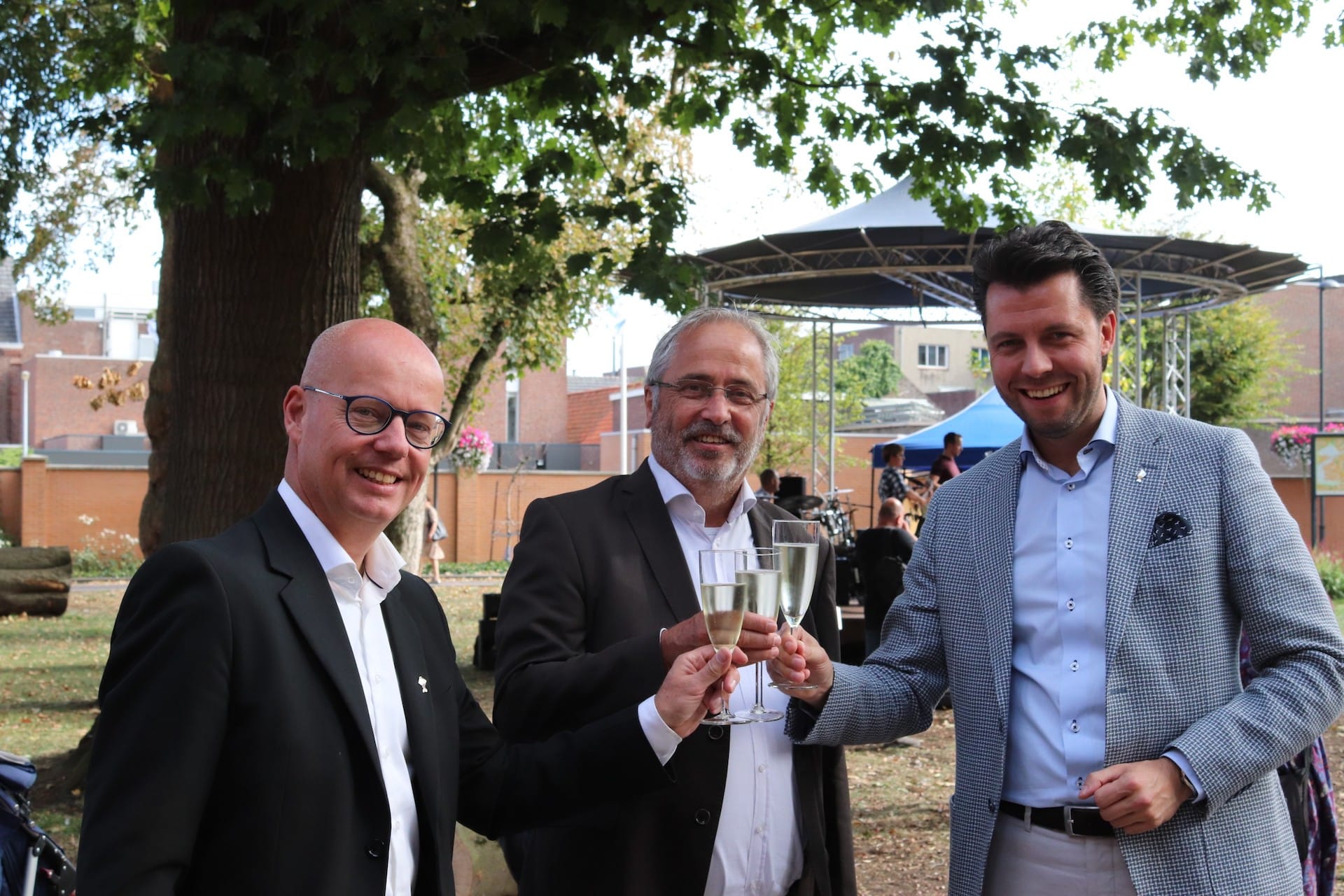 Foto: Kommissaris Henk Jacobs (l) en Kanselier Jasper Heesakkers (r) van de Rogstaekers heffen samen met directeur Emile Florack van RICK het glas op de onthulling van de gedenkplaat