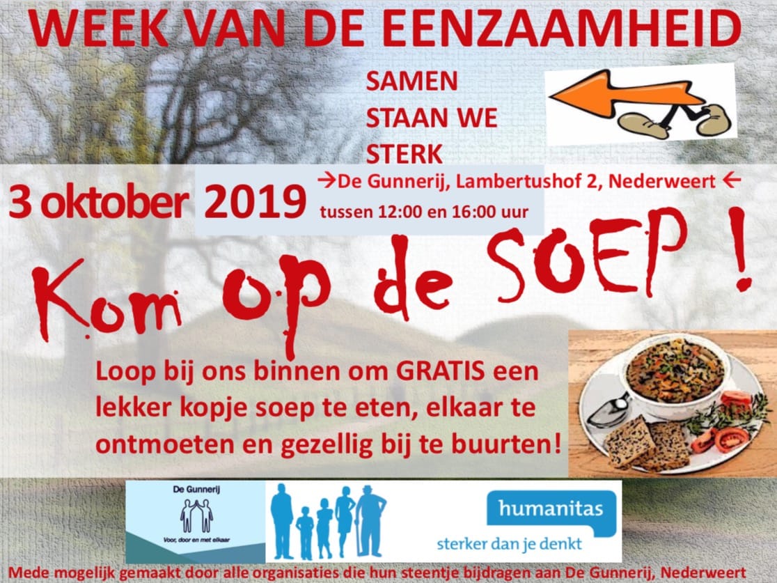 De Gunnerij en stichting Humanitas nodigen iedereen uit om op donderdag 3 oktober vanaf 12.00 uur in De Gunnerij een gratis kop soep te nuttigen. Jong of oud: iedereen: is van harte welkom. Al deze evenementen zijn geheel gratis. Aanmelding is niet nodig.