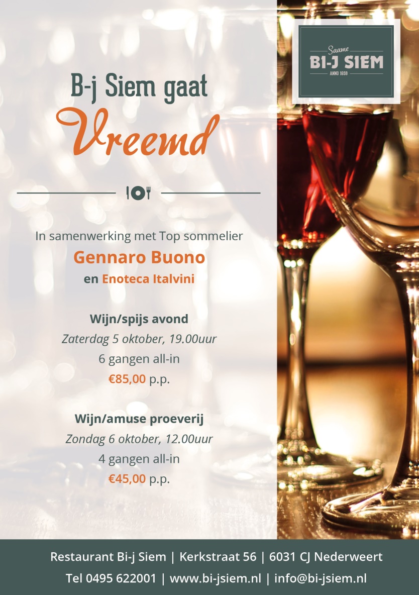 Op zaterdag 5 oktober zal hij Bi-j Siem een wijn/spijsavond met zijn kennis van wijnen professioneel begeleiden. De brigade van Bi-j Siem bereidt en serveert een 6 gangen diner incl. amuses. De begeleidende wijnen zijn van Enoteca Italvini.