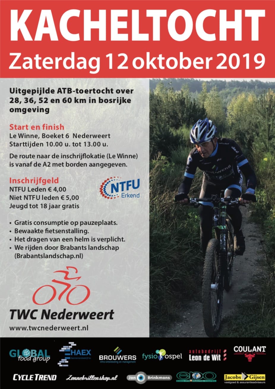 Zaterdag 12 oktober is het dan weer zover. Dan organiseert TWC Nederweert de jaarlijkse MTB Kacheltocht door het buitengebied van het Weerterland. Anders dan andere jaren wordt de kacheltocht nu eerder in het mtb-toertocht seizoen georganiseerd én wordt de kacheltocht nu op zaterdag gereden. Voor zowel de ervaren mtb-er, maar ook voor de onervaren mtb-er is dit een mooie tocht. De hoogte verschillen zijn beperkt en brede paden en smalle single tracks wisselen elkaar regelmatig af. De route gaat door het Brabants landschap.