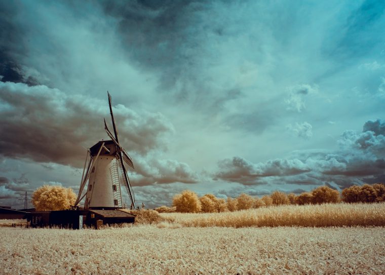 Laura Caris schildert in olieverf en fotografeert in infrarood, een voor het menselijke oog onzichtbaar licht dat echter wel in foto’s is vast te leggen. Infrarood foto’s zien er daardoor net iets anders uit dan we gewend zijn te zien. De fotoserie van grote prints van de windmolens en watermolens oogt daardoor ook een beetje als foto’s uit een parallel universum. Tegelijk vertrouwd en sprookjesachtig, vreemd. De foto’s roepen vragen op of datgene wat we zien wel de (enige, echte) werkelijkheid is?