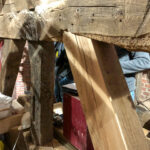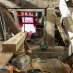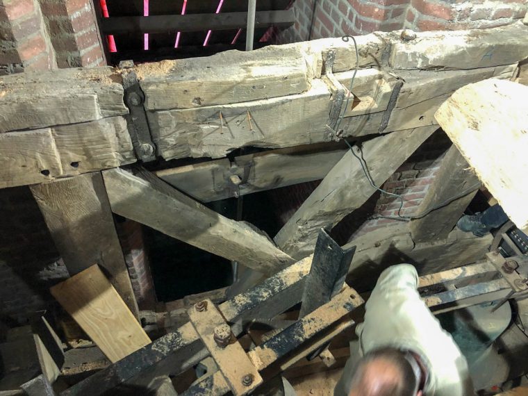 Het gaat hier om een gigantische eikenhouten constructie van balken, schoren en kruisbenen waaraan de zware bronzen luidklokken zijn opgehangen. Een aantal zwakke balken moet vervangen worden en dat gebeurt met traditionele technieken en materialen. Dat is Adriaens wel toevertrouwd.