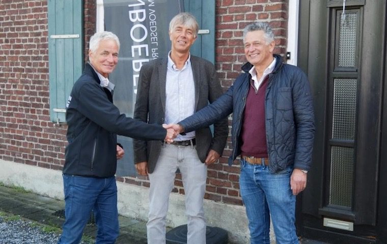 Foto: Ron Geurts (voorzitter Herenboeren Land van Weert) Tom Waller (Stichting Grondbeheer) en Tjeu Kneepkens (verkoper van de boerderij en gronden).