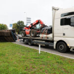 De politie is gewaarschuwd en een berger zal ter plaatse komen om de aanhanger weer rechtop te zetten. Er raakte niemand gewond.