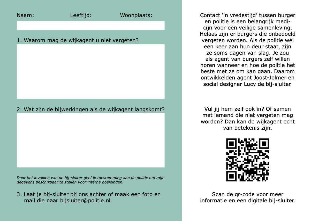 Daarom ontwikkelden agent Joost-Jelmer en social designer Lucy de ‘Bij-sluiter’. Vul jij hem zelf ook in? Of samen met iemand die niet vergeten mag worden? Dan kan de wijkagent echt van betekenis zijn.