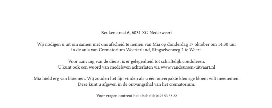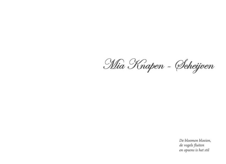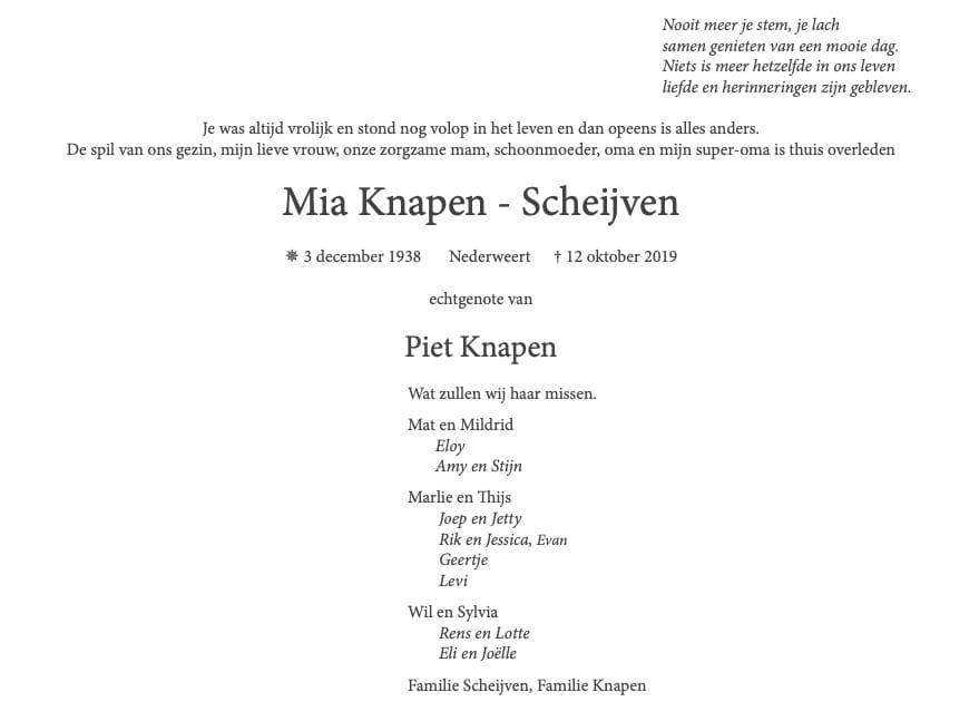 Beste Piet, kinderen, kleinkinderen en achterkleinkind, wat een schok, onwerkelijk, maar helaas de harde realiteit. We hoorden het 2 dagen geleden, vol ongeloof zijn wij. Heb 2 weken geleden nog met Mia gebabbeld. Altijd vrolijk, vriendelijk en lachend.