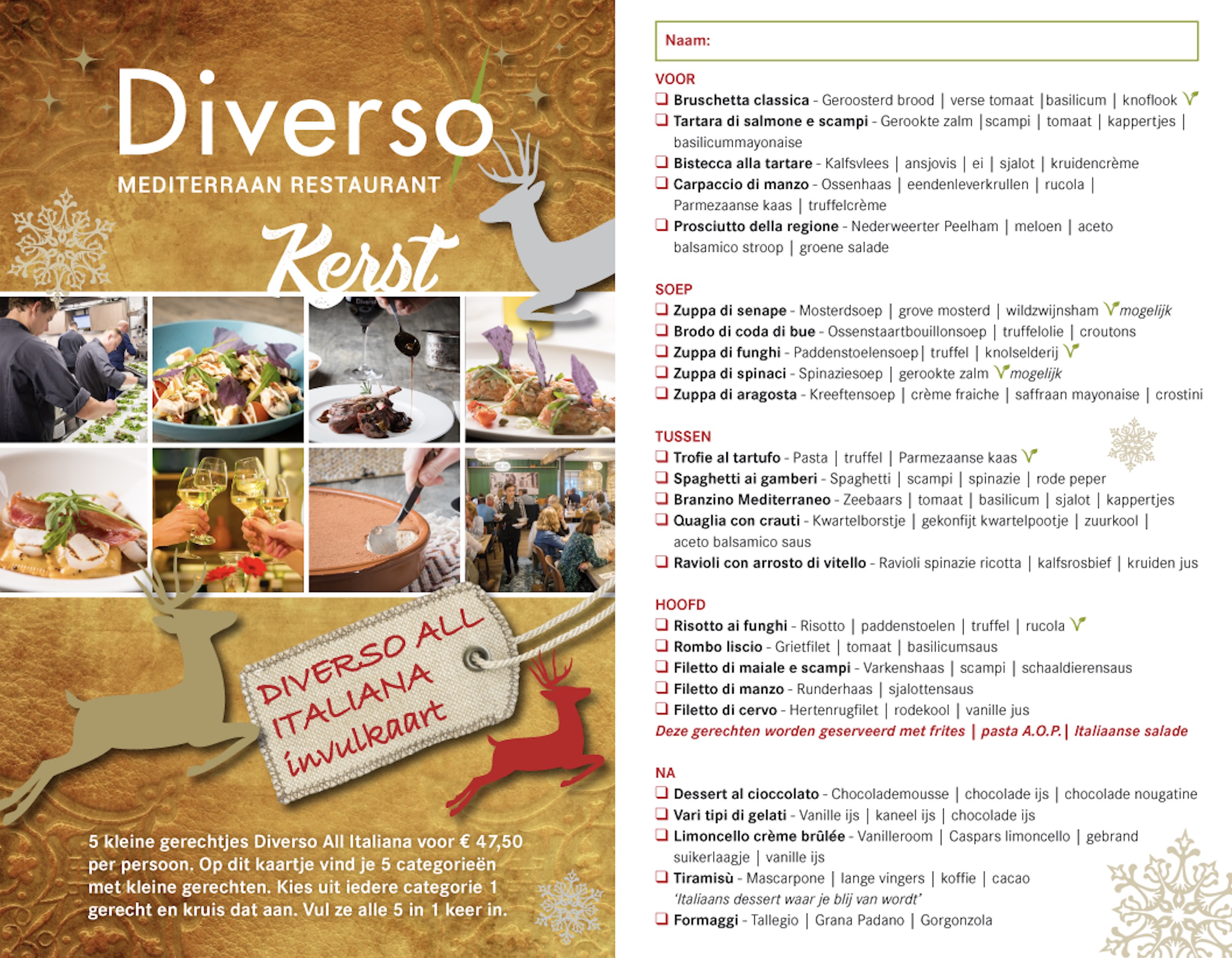 Speciaal voor de kerstdagen is het invulkaartje samengesteld met kerstgerechten. Je kiest pas aan tafel welk gerechtje per gang je wilt eten. Iedereen kruist op zijn kaartje aan welk gerecht per gang gewenst is. Het team onder leiding van Caspar, John en Kitty gaat aan de slag om je een heerlijke kerst te laten beleven bij Diverso.