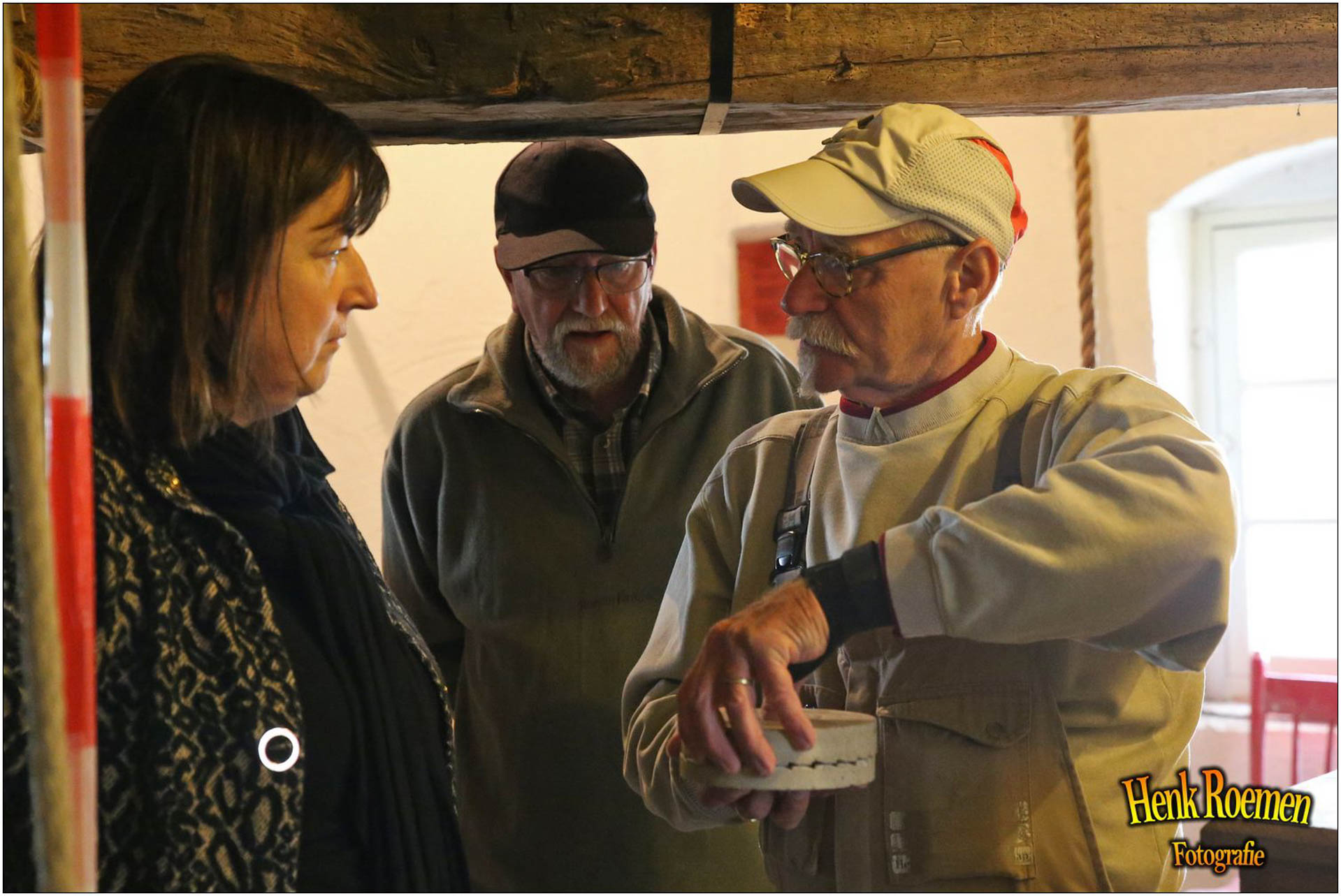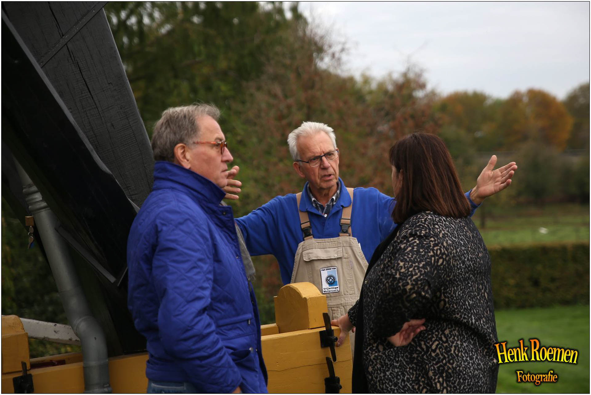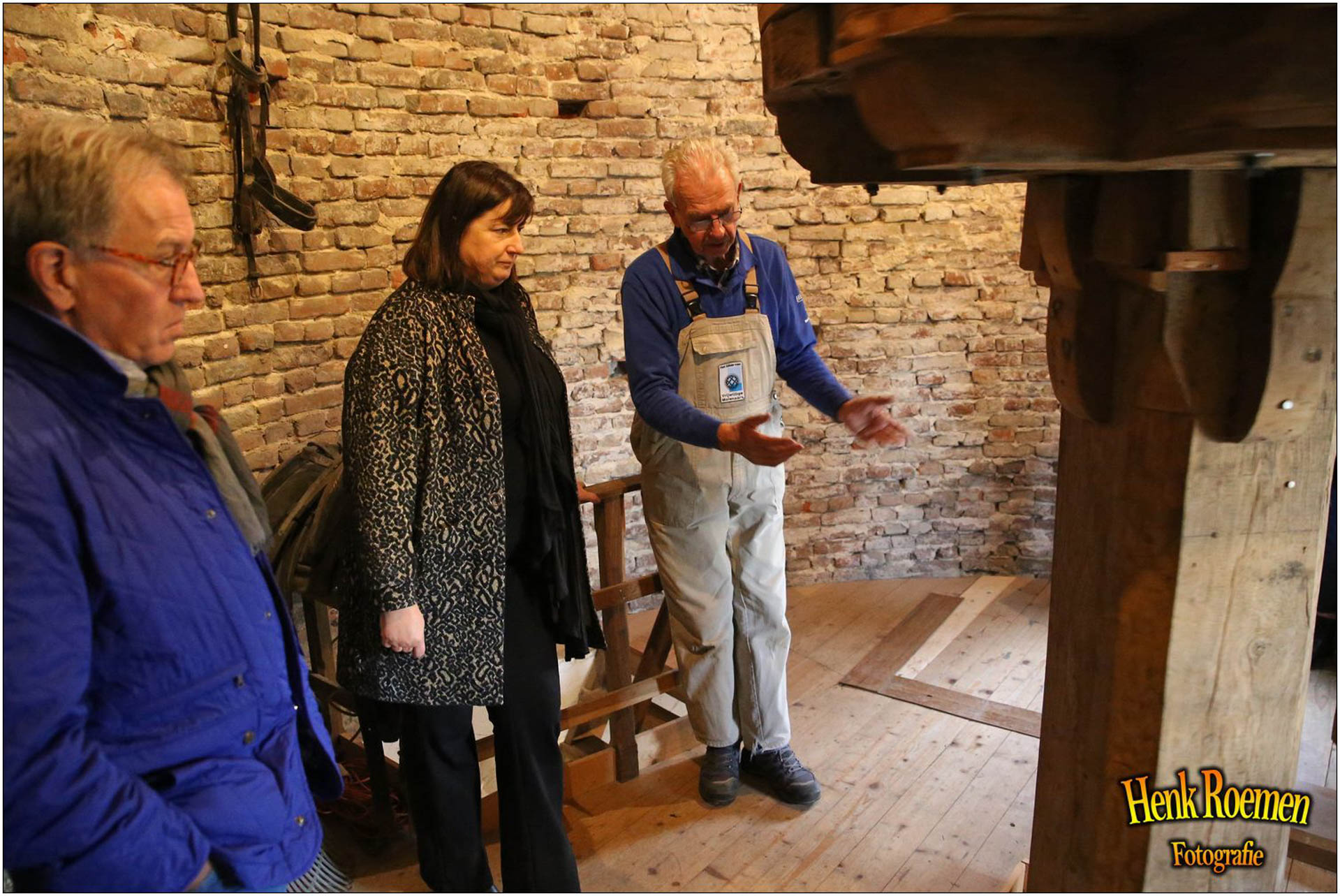 De molenaars en veel vrijwilligers waren bij dit bezoek aanwezig. Zij liet zich uitgebreid informeren over de geschiedenis van de molen, de werking en de onderhoudstoestand. Ook had ze veel belangstelling voor de molenwinkel waar veel zelf samengestelde broodmixen te koop zijn. Een nieuw verdienmodel voor de molen. Burgemeester Op de Laak liet zich op alle zolders van de molen uitvoerig informeren over de werking van de molen. Ook had ze veel interesse in de molenbiotoop en hoe deze in stand te houden.
