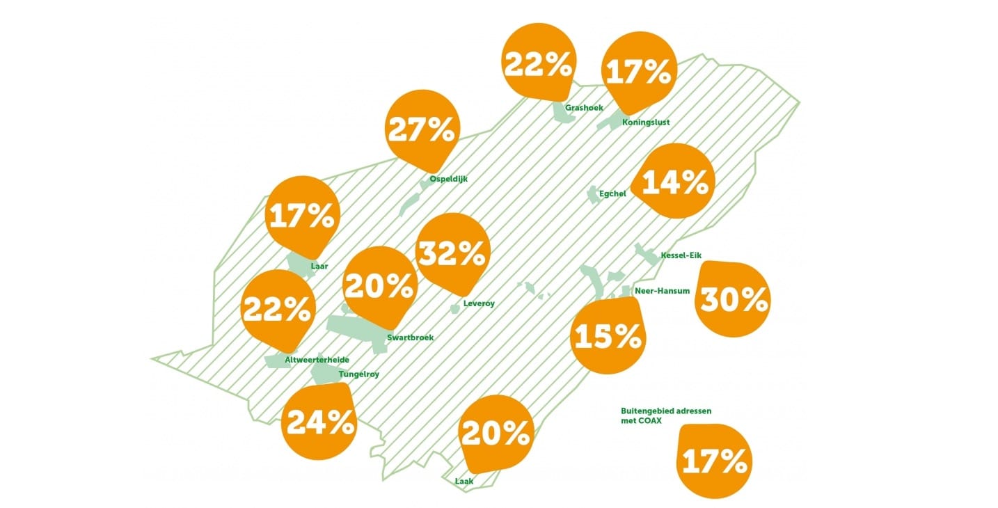 De vraagbundeling voor kleine kernen in Noordwest Limburg is opgedeeld in 13 deelgebieden. Per deelgebied is een minimale deelname van 35% benodigd vóór 28 oktober 2019. Tevens zijn er adressen in het buitengebied met coax aangeschreven. Is het deelnamepercentage van 35% bereikt op 28 oktober, dan wordt begin volgend jaar gestart met de aanleg van glasvezel.