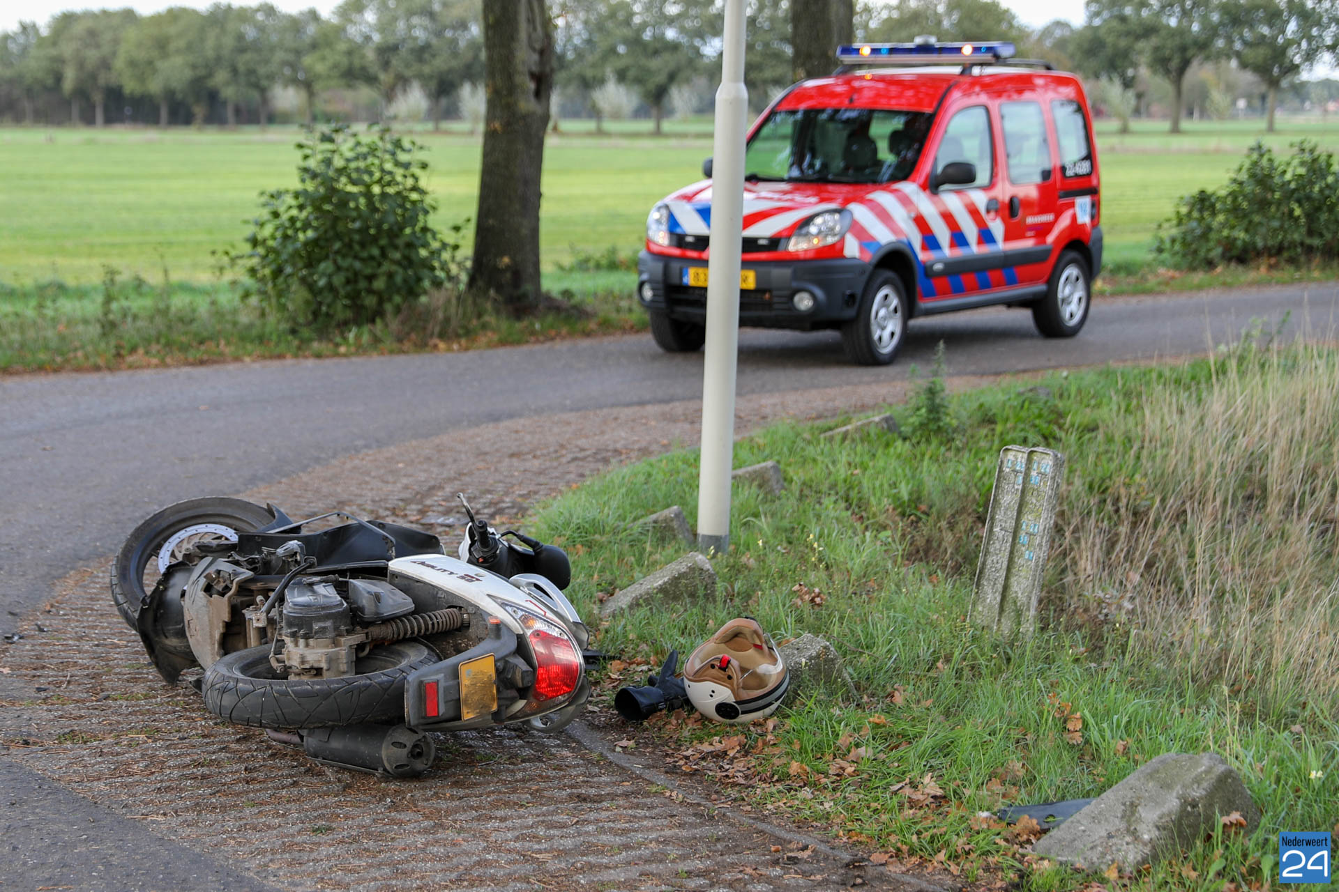 De scooterrijder reed op de Beliënberkdijk richting de Scheidingsweg. Op de t-splitsing kwam hij in botsing met een auto die van rechts kwam. Hierdoor raakte de man ten val en kwam met zijn hoofd op een betonblok. Gelukkig had hij een helm op. Verder had hij last van zijn knieën en hand.