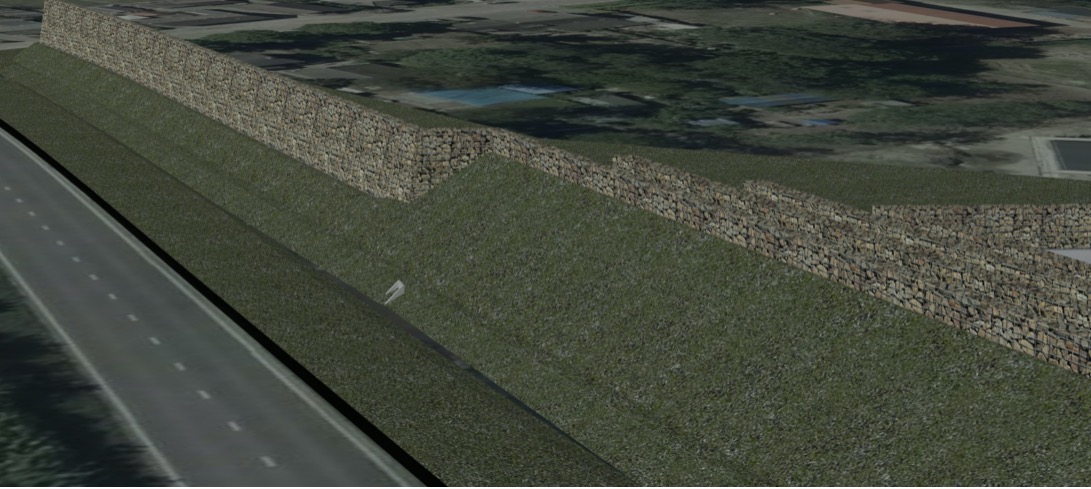 Het geluidsscherm heeft een kern van gebroken puin, omhuld met zogenaamde schanskorven. Dit zijn rechthoekige blokken van staaldraad, gevuld met natuurstenen. Deze constructie zorgt ervoor dat geluid gedempt wordt.