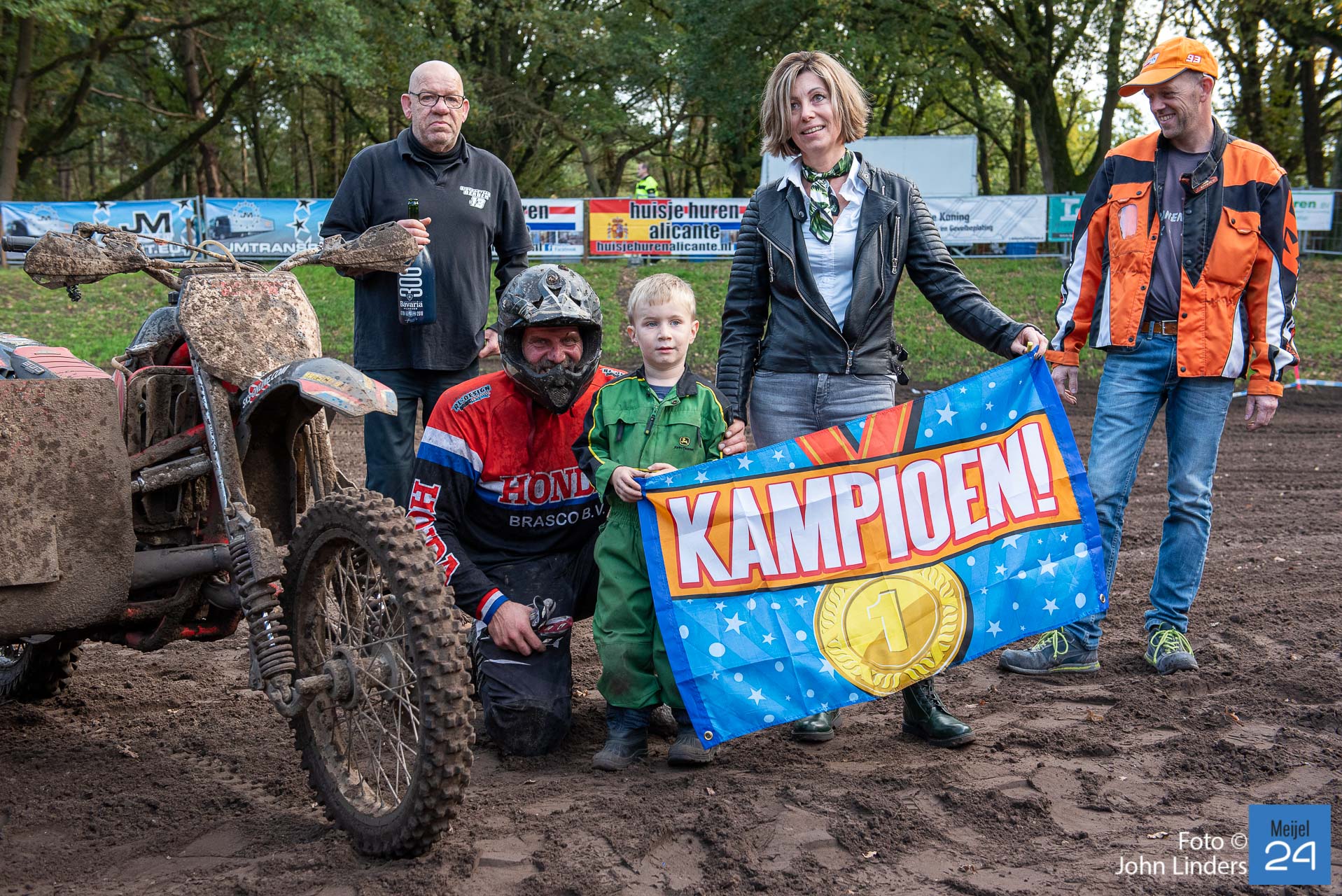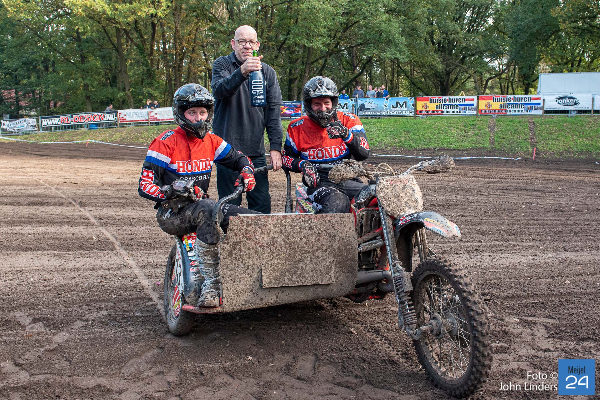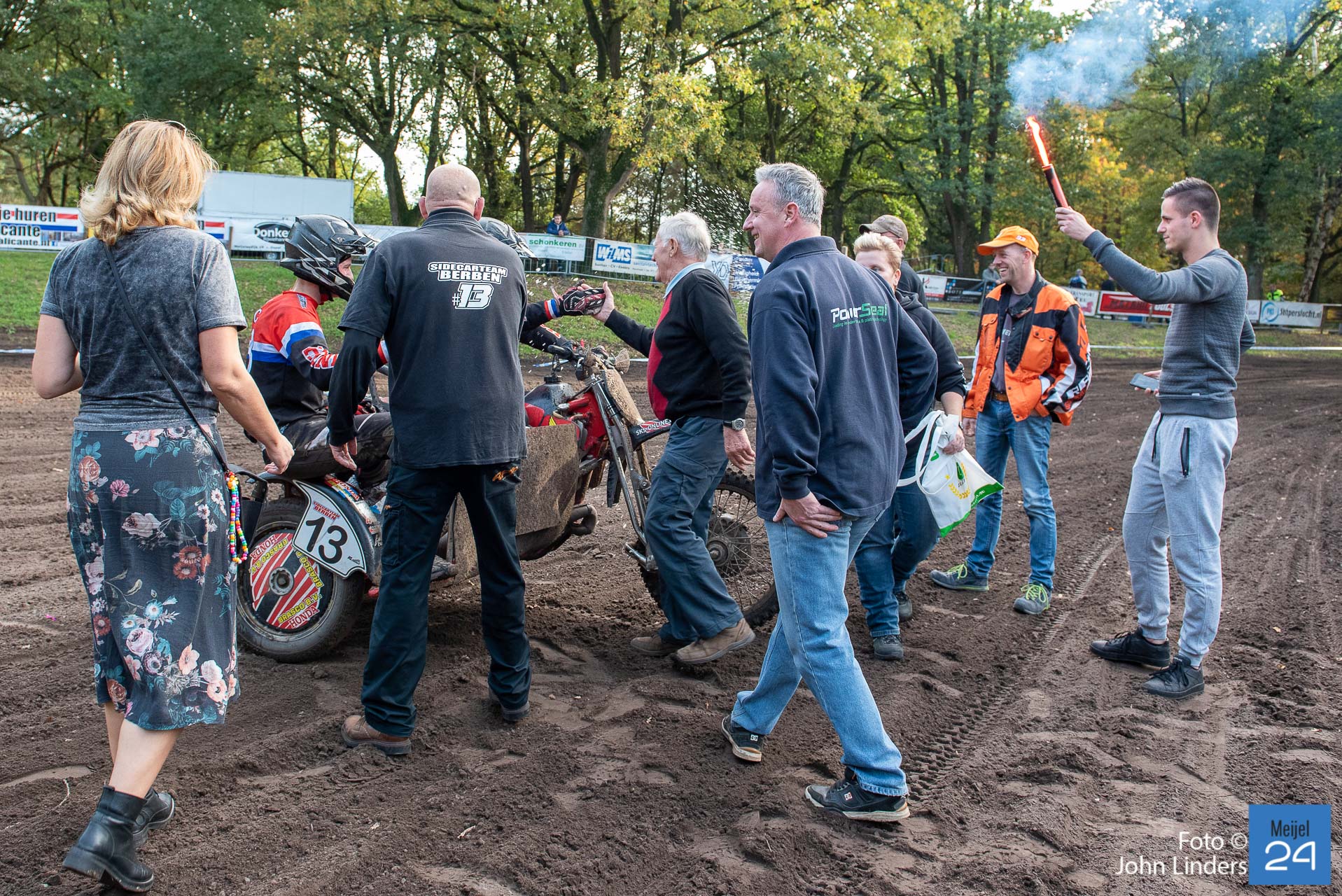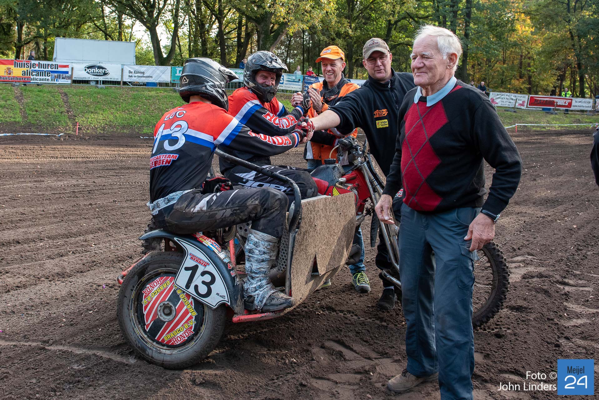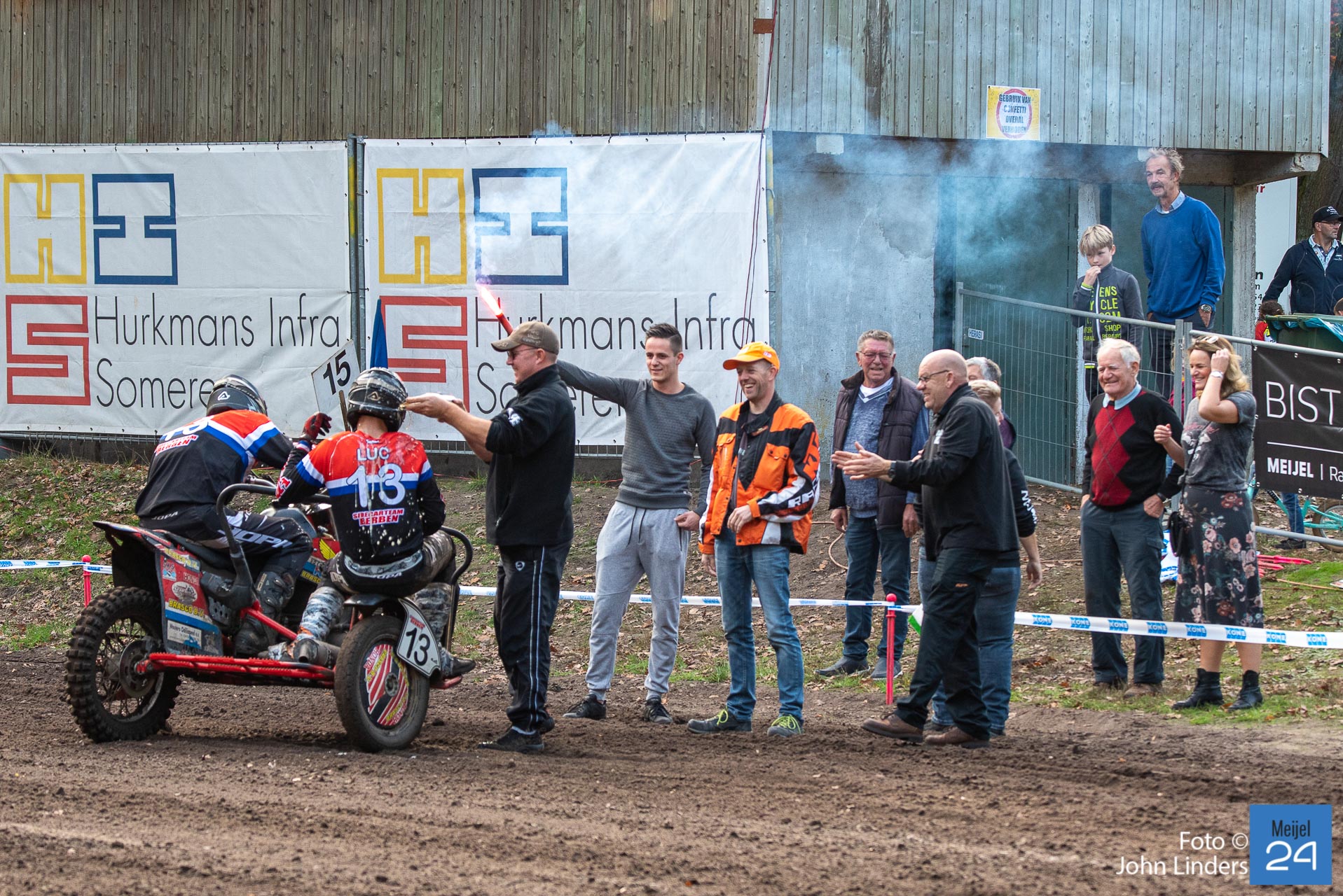 Veel familieleden en fans waren vandaag naar het circuit aan de Peelweg 1 in Meijel gekomen om het zijspan duo te feliciteren en te huldigen. Tijdens de tweede manche werd het nieuwe nummerbord voor op de motor geschroefd en van startnummer 13 werd snel de 3 weggehaald om met startnummer 1 mee te rijden.