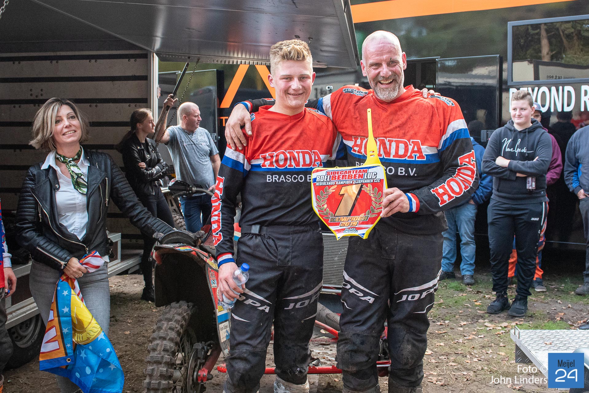 Op de motorcrossbaan De Vossenberg in Meijel werden Roel Berben (op de motor) en zoon Luc Berben (bakkenist) zaterdag Nederlands kampioen in de Classic Zijspan Cross 2 tact.