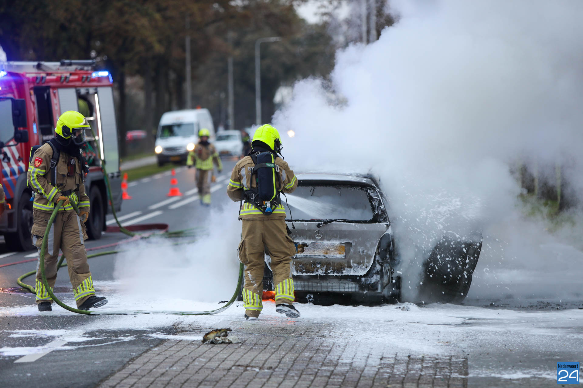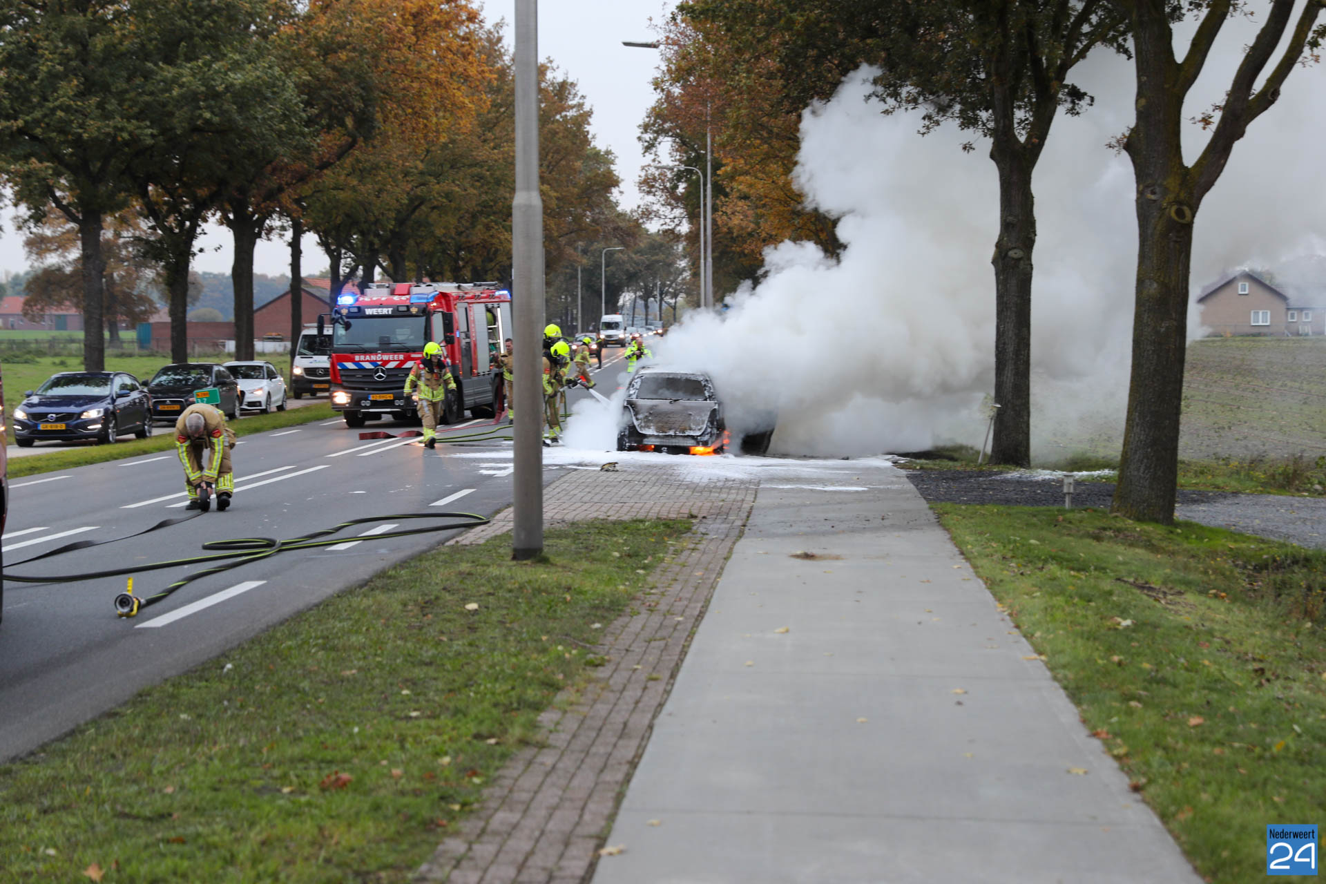 Vrijdagmiddag is een personenauto volledig uitgebrand op de Roermondseweg (N280) in Weert.