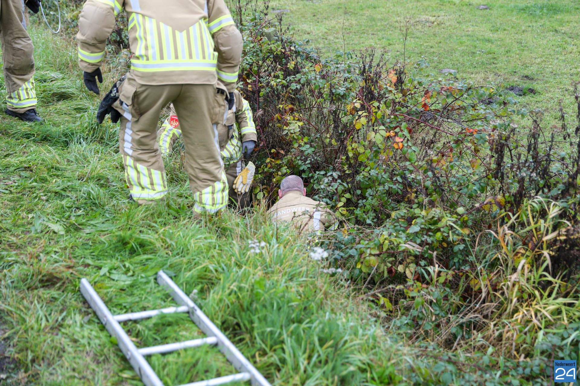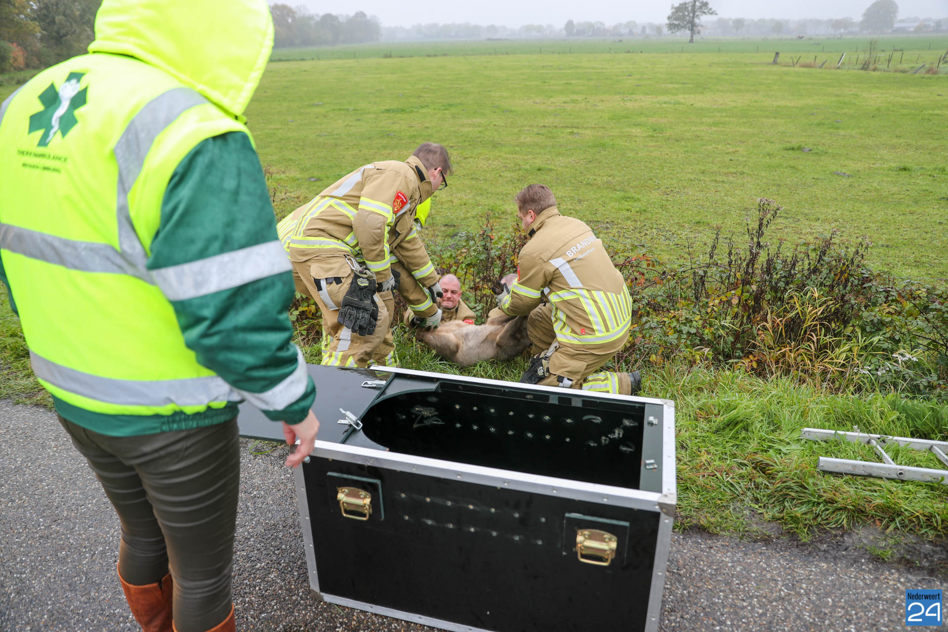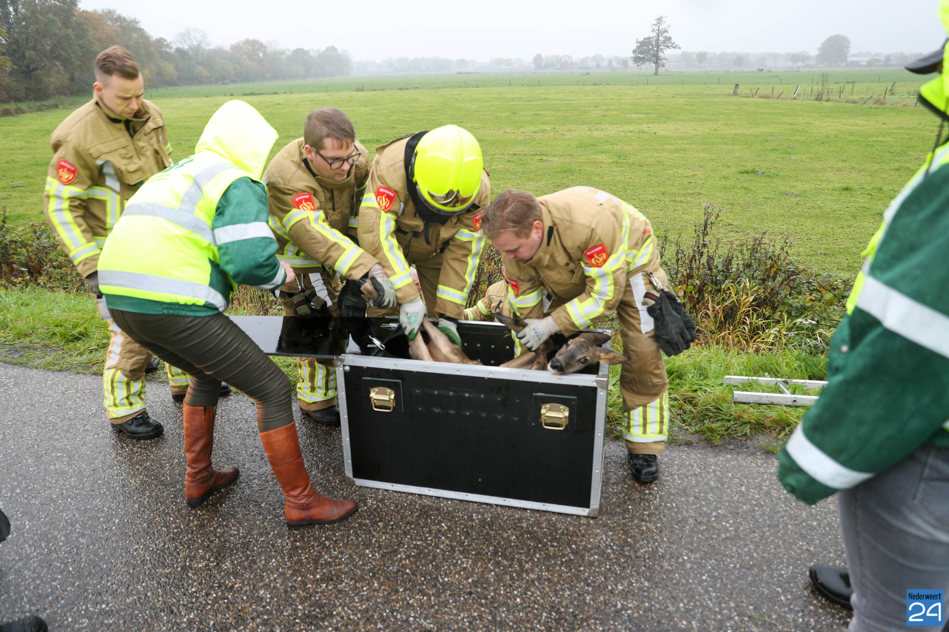 De brandweer van Nederweert werd opgeroepen om te assisteren. Met vereende krachten wisten de brandweerlieden het verzwakte dier uit de sloot te halen. De ree is vervolgens in een speciale kist meegenomen door de dierenambulance. Ze zullen kijken wat de verwondingen precies zijn en het dier verzorgen.