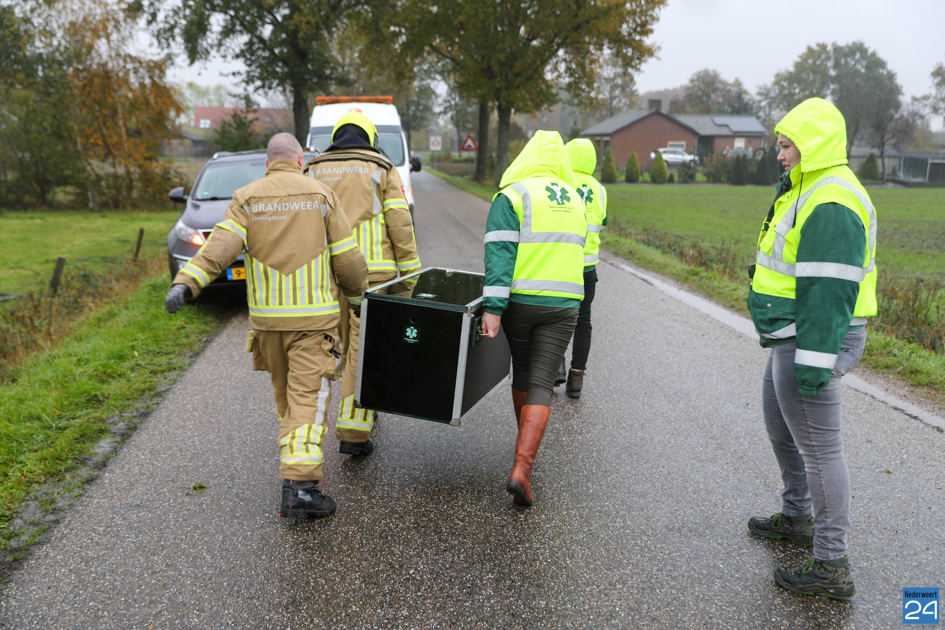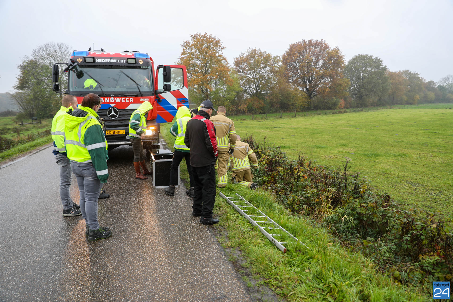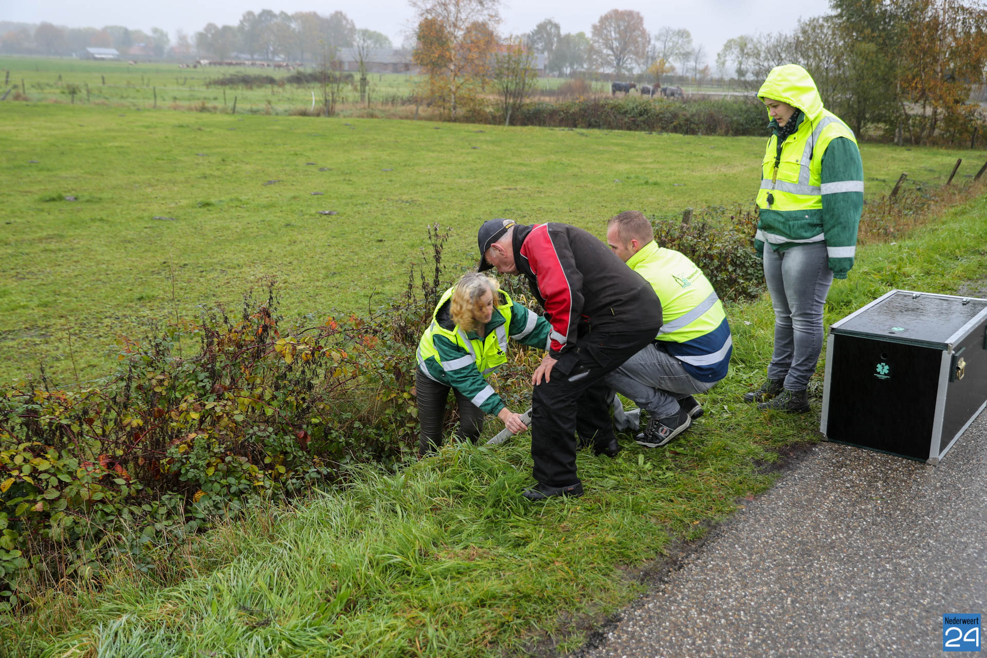 De brandweer van Nederweert werd opgeroepen om te assisteren. Met vereende krachten wisten de brandweerlieden het verzwakte dier uit de sloot te halen. De ree is vervolgens in een speciale kist meegenomen door de dierenambulance. Ze zullen kijken wat de verwondingen precies zijn en het dier verzorgen.