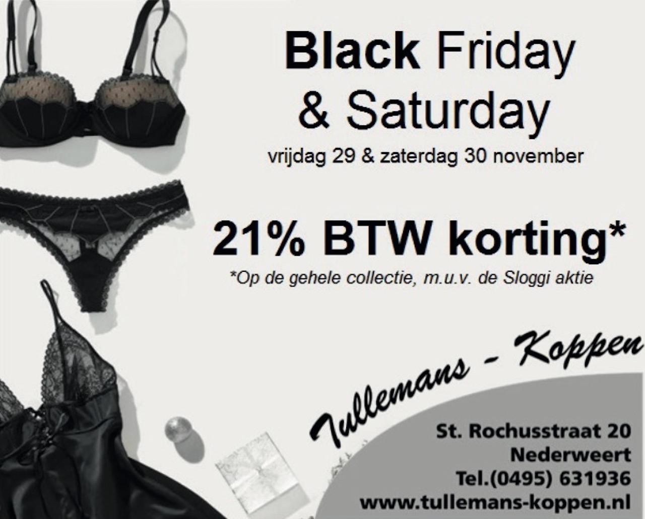 Black Friday komt er weer aan. De uit Amerika overgewaaide trend vindt ook in Nederland steeds meer populariteit. Zo ook in Nederweert bij Tullemans – Koppen. Daar kun je twee dagen profiteren van 21% BTW korting op de gehele collectie, m.u.v. de Sloggi actie.