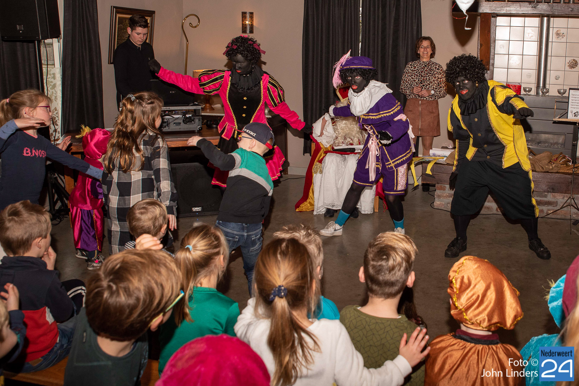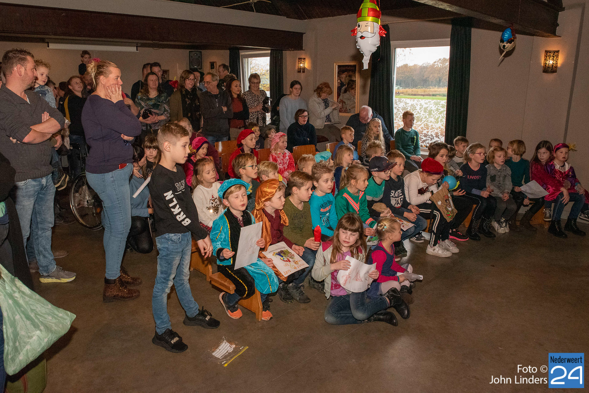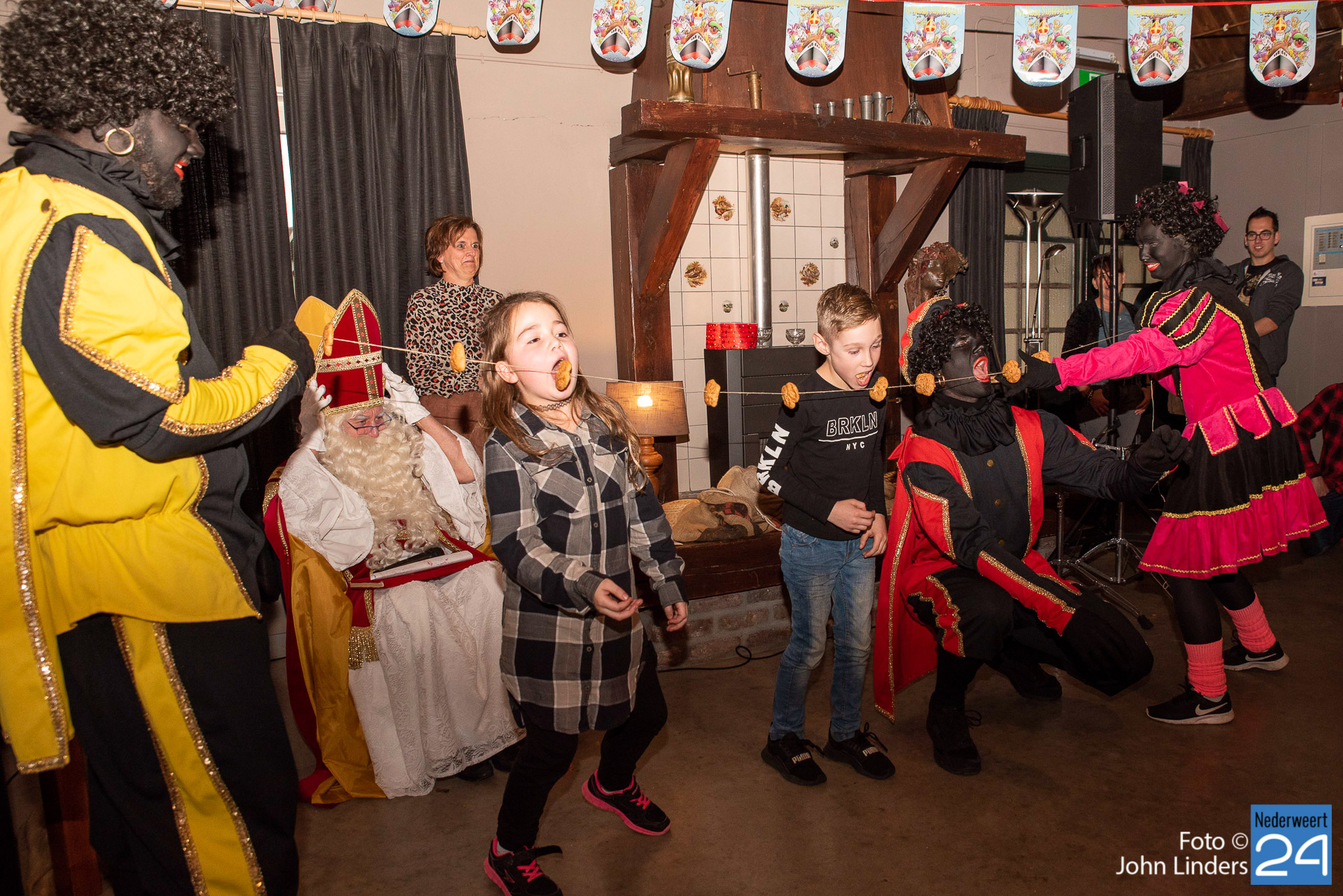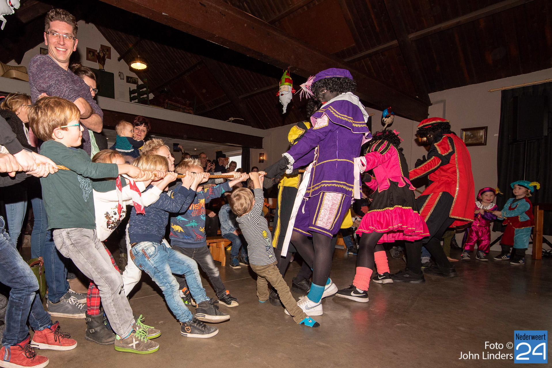 Ruim 40 kinderen hadden mooie kleurplaten, tekeningen, knutselwerkstukjes en één fopcadeautje gemaakt voor Sinterklaas. Er werd voor Sinterklaas een stukje gedrumd en ook de zwarte Pieten mochten dit even uitproberen.  De kinderen deden samen met de Pieten een dansje, een wedstrijdje taai taai happen en er werd een echte wedstrijd touwtrekken gehouden. “Alle kinderen van Ospeldijk zijn wel erg sterk” zei Sinterklaas. De Zwarte Pieten konden vandaag niet winnen.