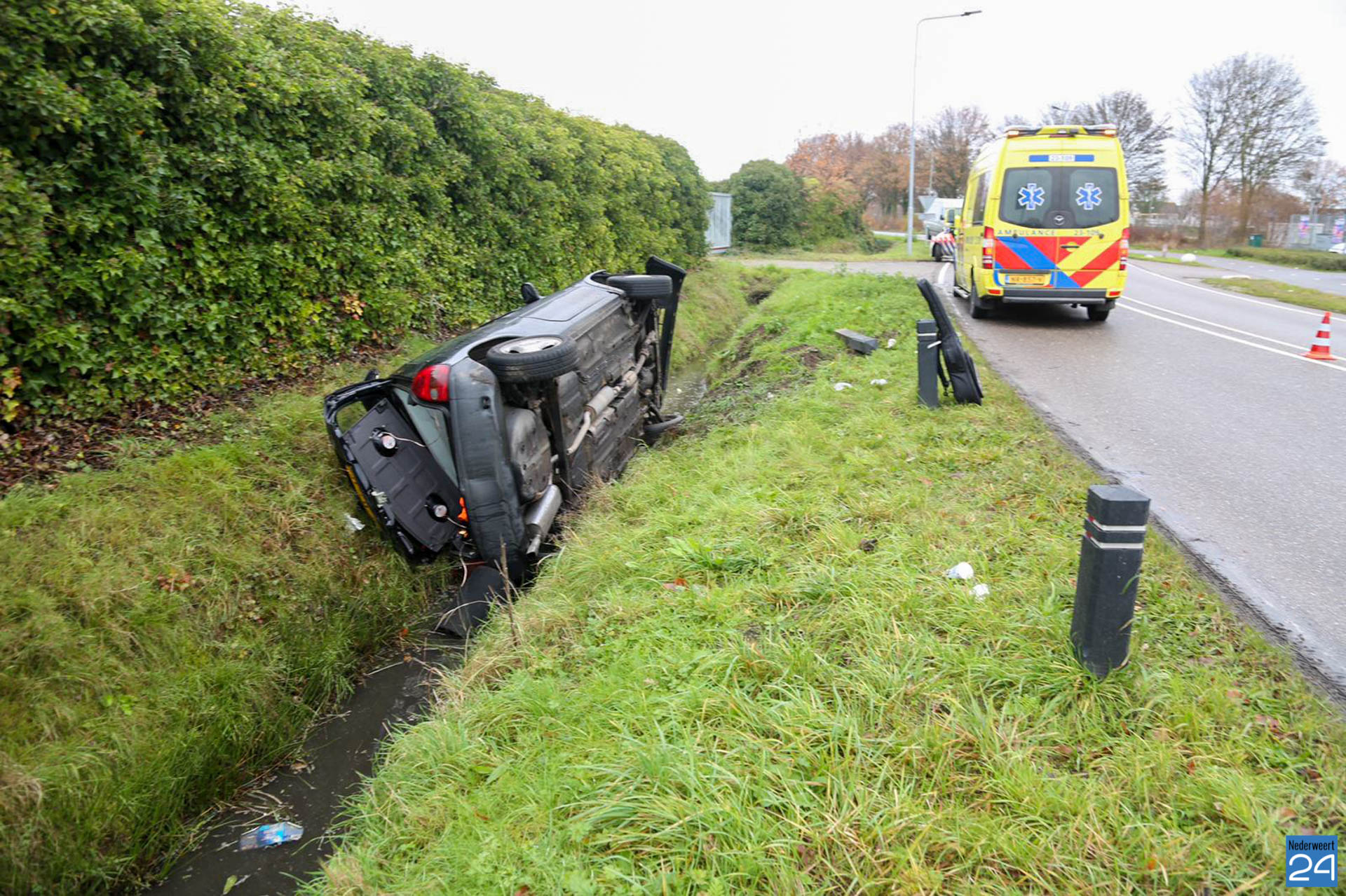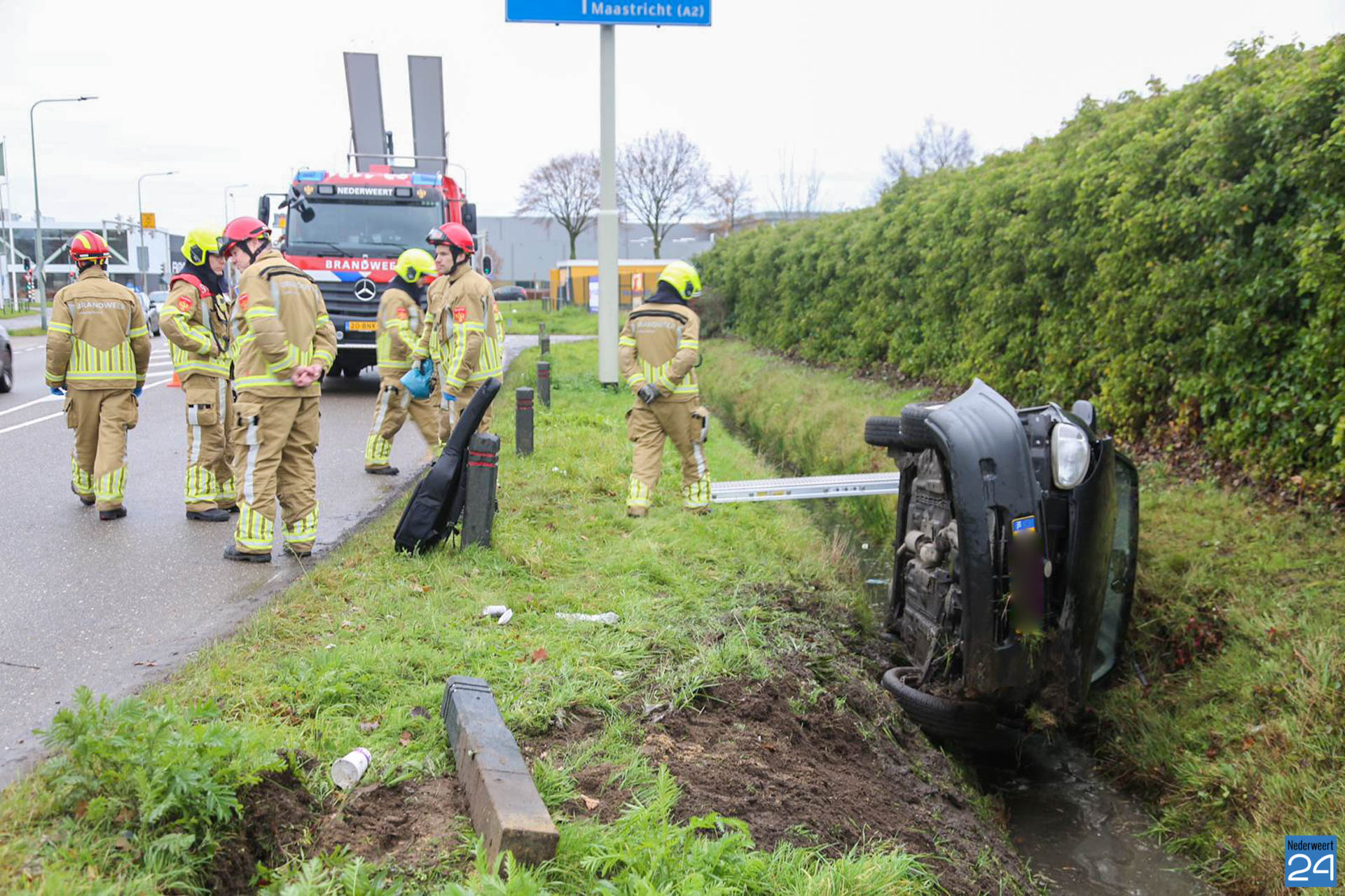 Een personenauto is zaterdagmiddag op zijkant in de sloot belandt op de Randweg-West in Nederweert.