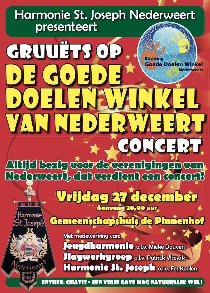Ook dit jaar geeft Harmonie Sint Joseph Nederweert rondom de kerstdagen weer een Gruuëts op … concert om een vereniging, stichting, specifiek persoon of wat dan ook eens extra in het zonnetje te zetten. De mogelijke thema’s worden ieder jaar ingezonden door de eigen leden en dit jaar heeft het bestuur gekozen voor de Goede Doelen Winkel Nederweert.