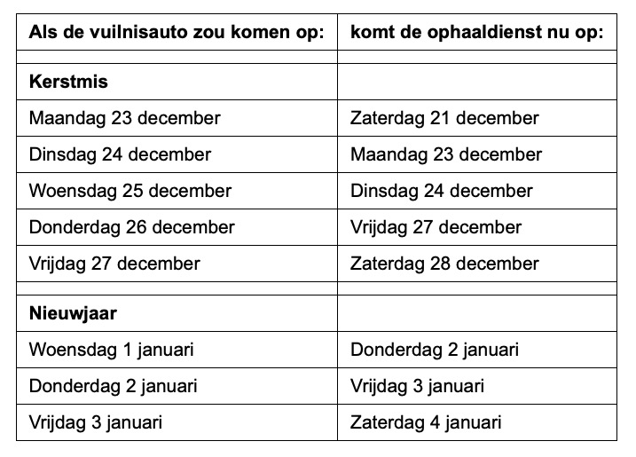 De huisvuilroutes worden gewijzigd tijdens de kerstperiode. De vuilniswagen begint om 07.00 (behalve op zaterdag om 06.30) uur te rijden. Wil je de duobak op tijd klaarzetten, eventueel de avond vóór de ophaaldag? De vuilniswagen kan namelijk op een ander tijdstip langskomen dan je gewend bent. Voor de komende twee weken ziet het schema er als volgt uit.