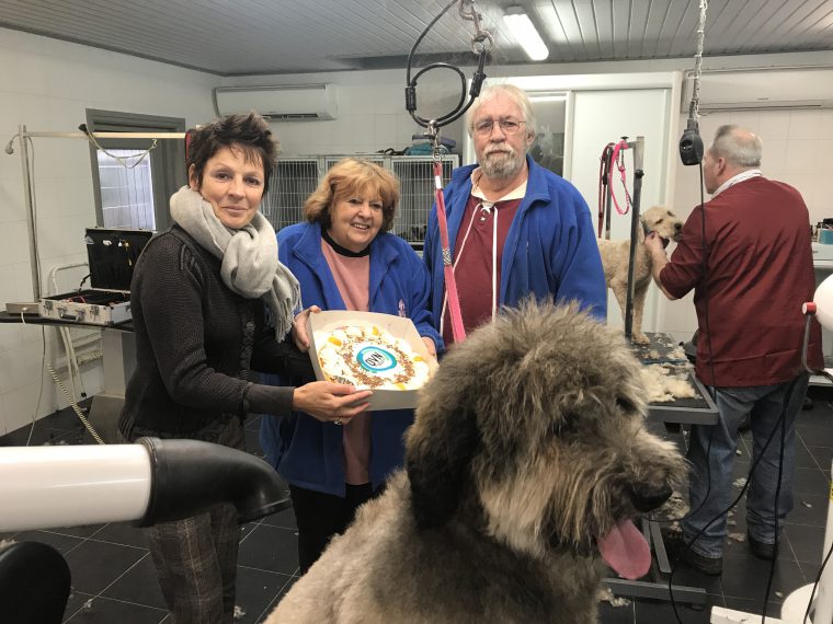Hondentrimsalon Jetty van der Hulst is het jongste lid van de Ondernemers Vereniging Nederweert (OVN). Speciaal voor deze gelegenheid overhandigde Conny van Laer namens de OVN een taart van bakkerij Broekmans aan.