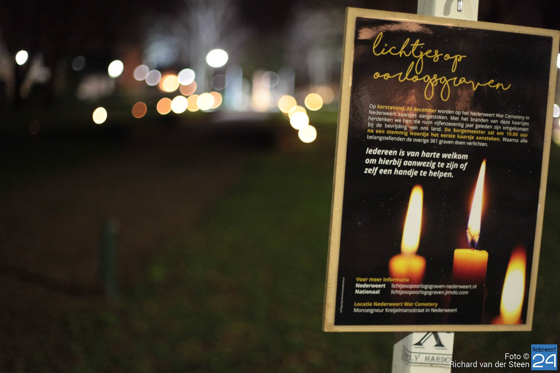 Op het Nederweert War Cemetery in Nederweert werden 363 lichtjes ontstoken. Jong en oud hielpen mee om de lichtjes aan te steken op de oorlogsbegraafplaats aan de Monseigneur Kreijelmansstraat. De initiatiefnemers Jermain Nicholls en Henny van der Steen hadden voor windbestendige Finse kaarsen gezorgd. De kaarsen blijven dit jaar in de kerstnacht tot het ochtendgloren branden.