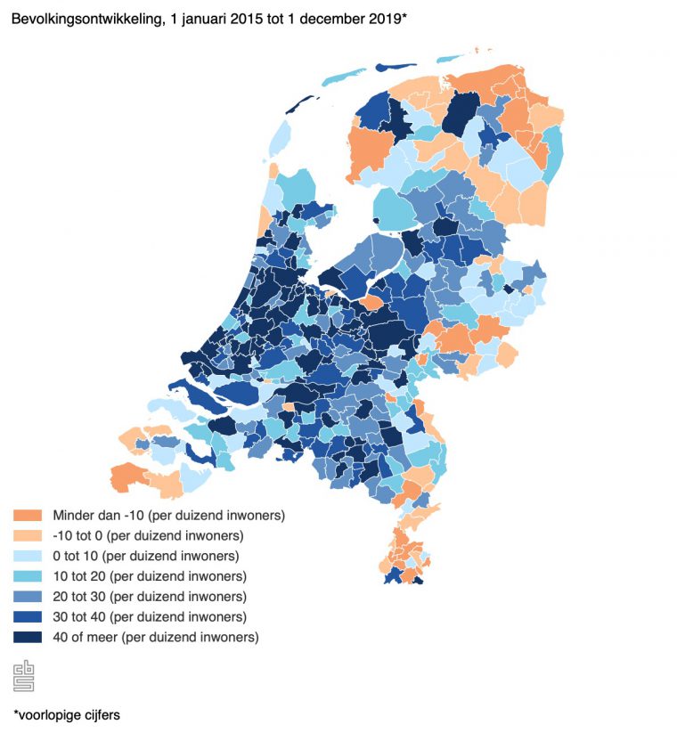 In 2019 groeide de bevolking in kleinere gemeenten rond de grote steden relatief gezien het sterkst, vooral door verhuizingen vanuit andere gemeenten. In absolute zin kregen de grootste steden er de meeste inwoners bij, voornamelijk door immigratie. Het aantal gemeenten met bevolkingskrimp nam voor het tweede achtereenvolgende jaar af. Dat meldt het CBS op basis van voorlopige cijfers tot 1 december 2019.