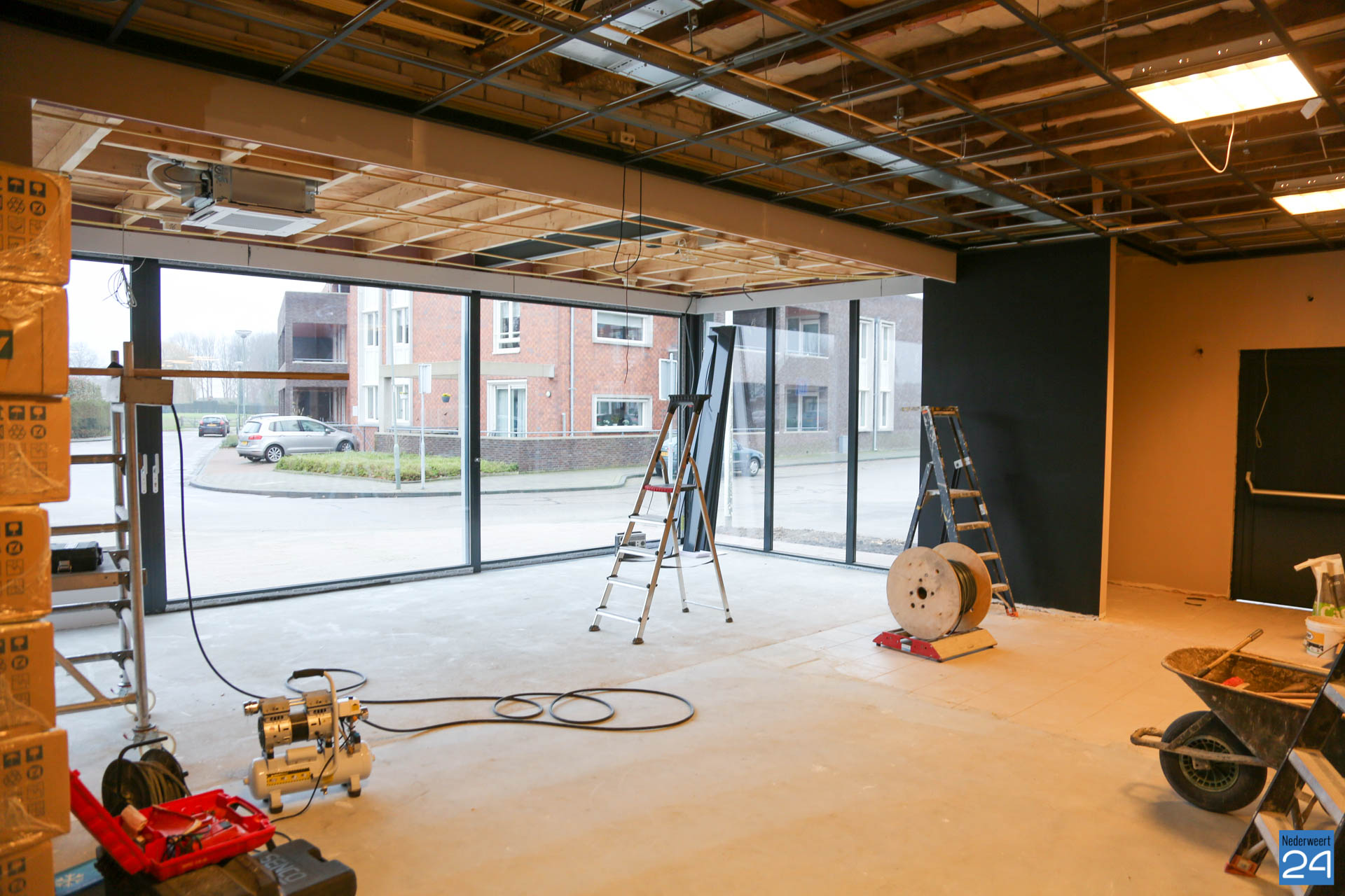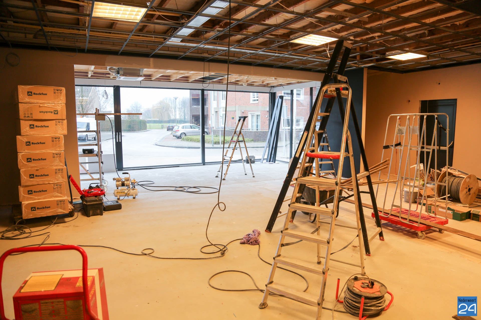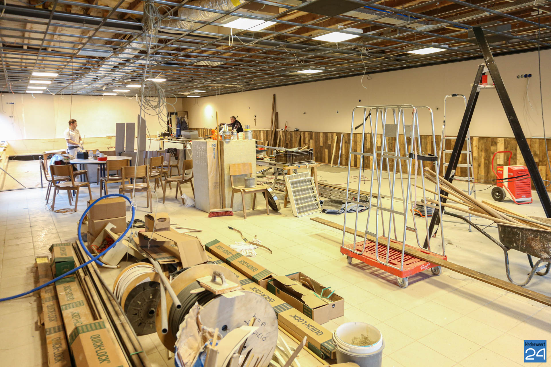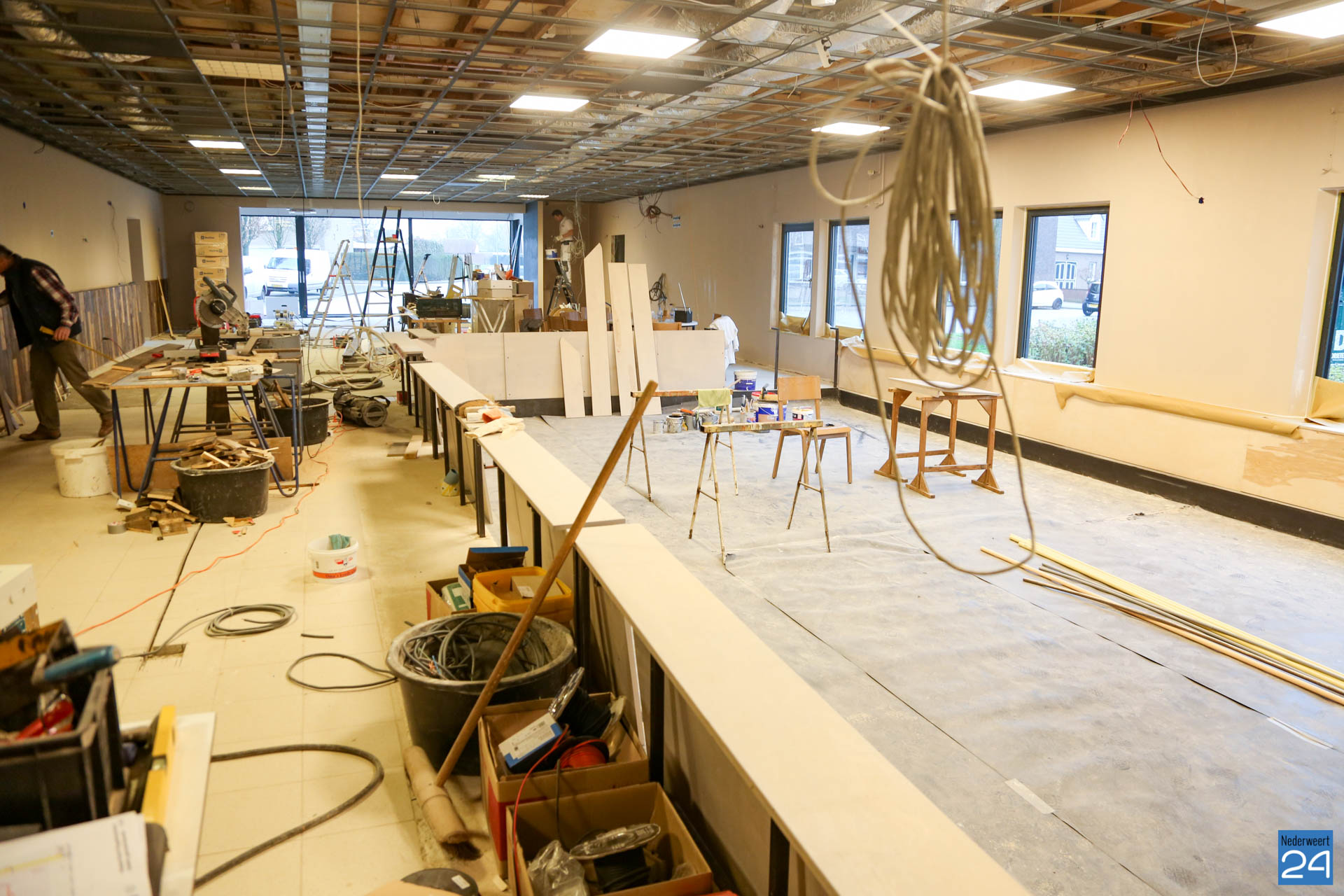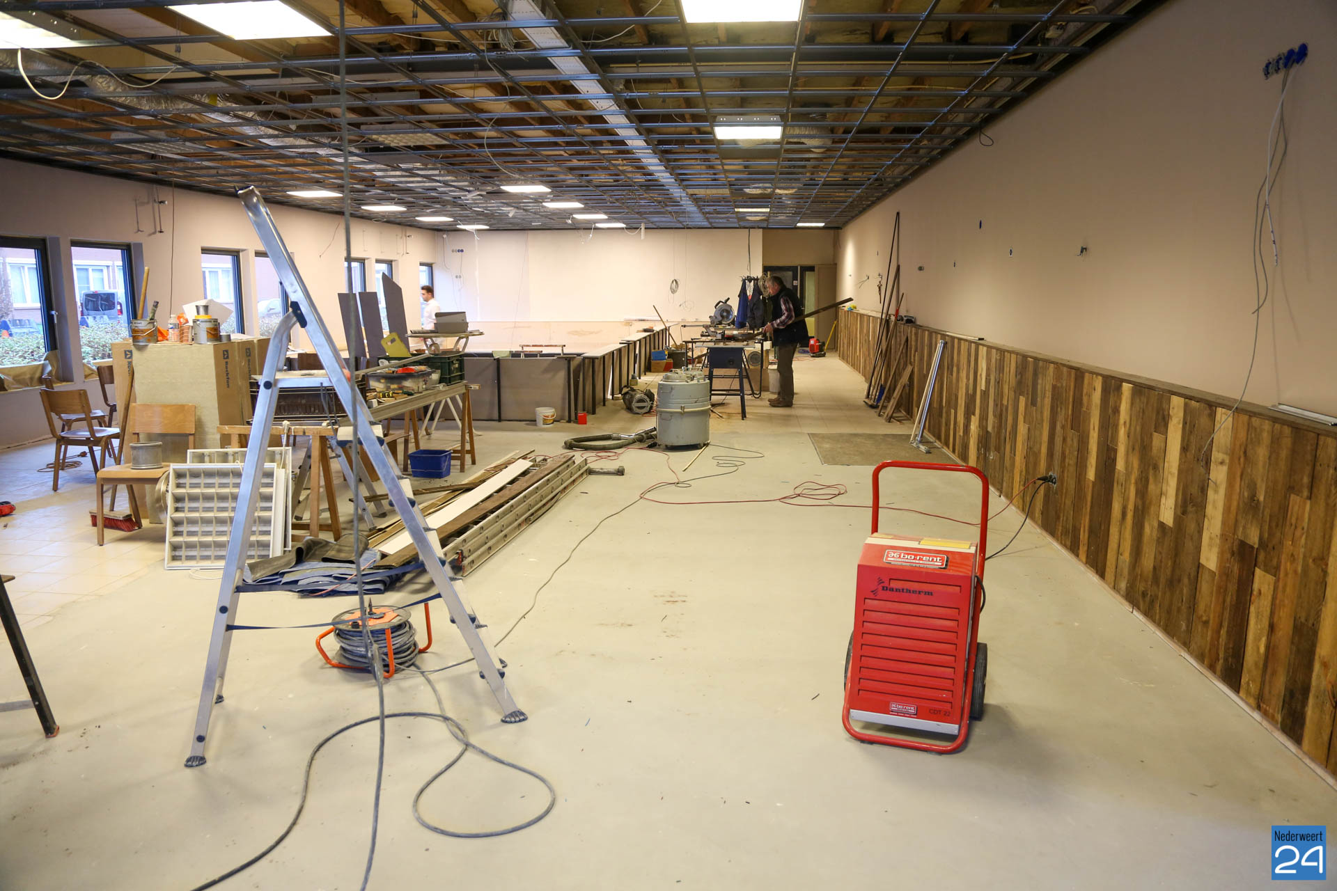 De grote verbouwing bij gemeenschapshuis Haaze-Hoof in Ospel vordert gestaag. Men is inmiddels begonnen aan de afrondende fase. Het café wordt omgetoverd naar een sfeervolle brasserie met de naam; ‘Vrienden van de Peel‘. Uitvoerder Martien Beerens vertelt dat deze week de vloer wordt geëgaliseerd, het plafond gerealiseerd wordt en de bar wordt geplaatst. Volgende week zal de vloer aangelegd worden.