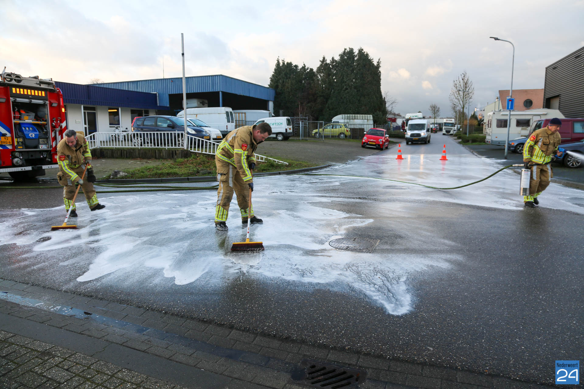 Het wegdek is met een speciaal reinigingsvloeistof ingespoten. Een bezemwagen van de gemeente Weert komt de kruising schoonvegen.