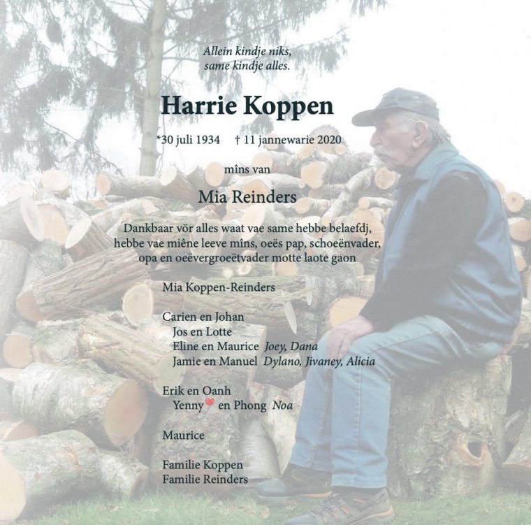 Hiel vul sterkdje met ut verlees van Harrie…ich kin Harrie nog als “Harrie vanne Bekker”…..kwoom joare beej os de mik bezurge.