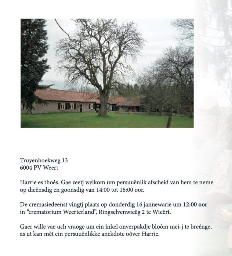 In onze herinnering leeft Harrie voort als een rasverteller, begaan met het historisch erfgoed en de bewoners daarvan in Nederweert. Wij zijn dankbaar voor de vele jaren dat hij onze voorzitter en inspirator was. Mia, kinderen, klein- en achterkleinkinderen, veel sterkte met het verwerken van dit verlies.