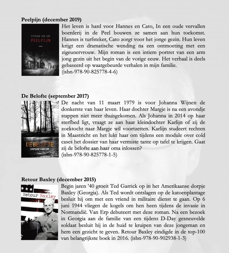 ‘Mijn opa komt uit Nederweert en was een turfsteker. De armoede kleefde aan hem en zijn gezin. Talloze malen hoorde ik de vaak trieste verhalen aan van het harde leven in het vroegere veengebied. Nadat ik een kleindochter van oud-burgemeester Smulders van Someren sprak, hij werd vermoord in de nacht van 15 augustus 1944, wist ik dat ik haar en mijn familiegeschiedenis in een roman aan elkaar moest knopen,’ aldus schrijver Stephan van Erp.