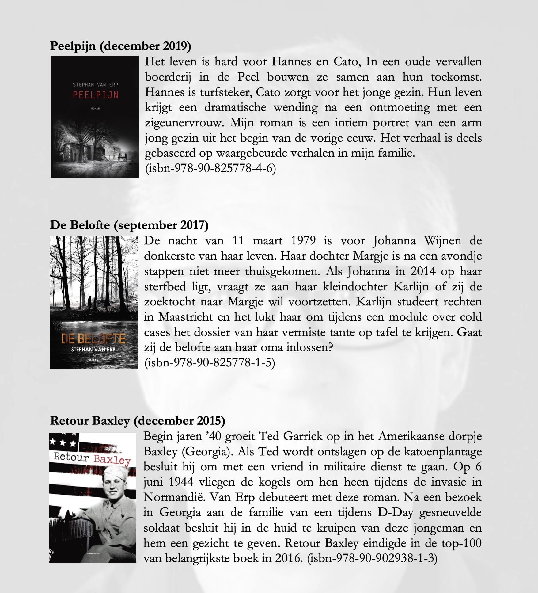 Van Erp schreef eerder de roman De Belofte (2017) en Retour Baxley (2015). Hij volgde aan de schrijversvakschool Amsterdam de module ‘roman schrijven.’ Peelpijn is verkrijgbaar bij Bruna-Gommans (Nederweert), Primera (Asten en Someren), Bruna (Deurne), Letters&Zo (Asten), Boekhandel Hub Berkers (Deurne), VVV Asten, Bol.com en via www.stephanvanerp.eu.